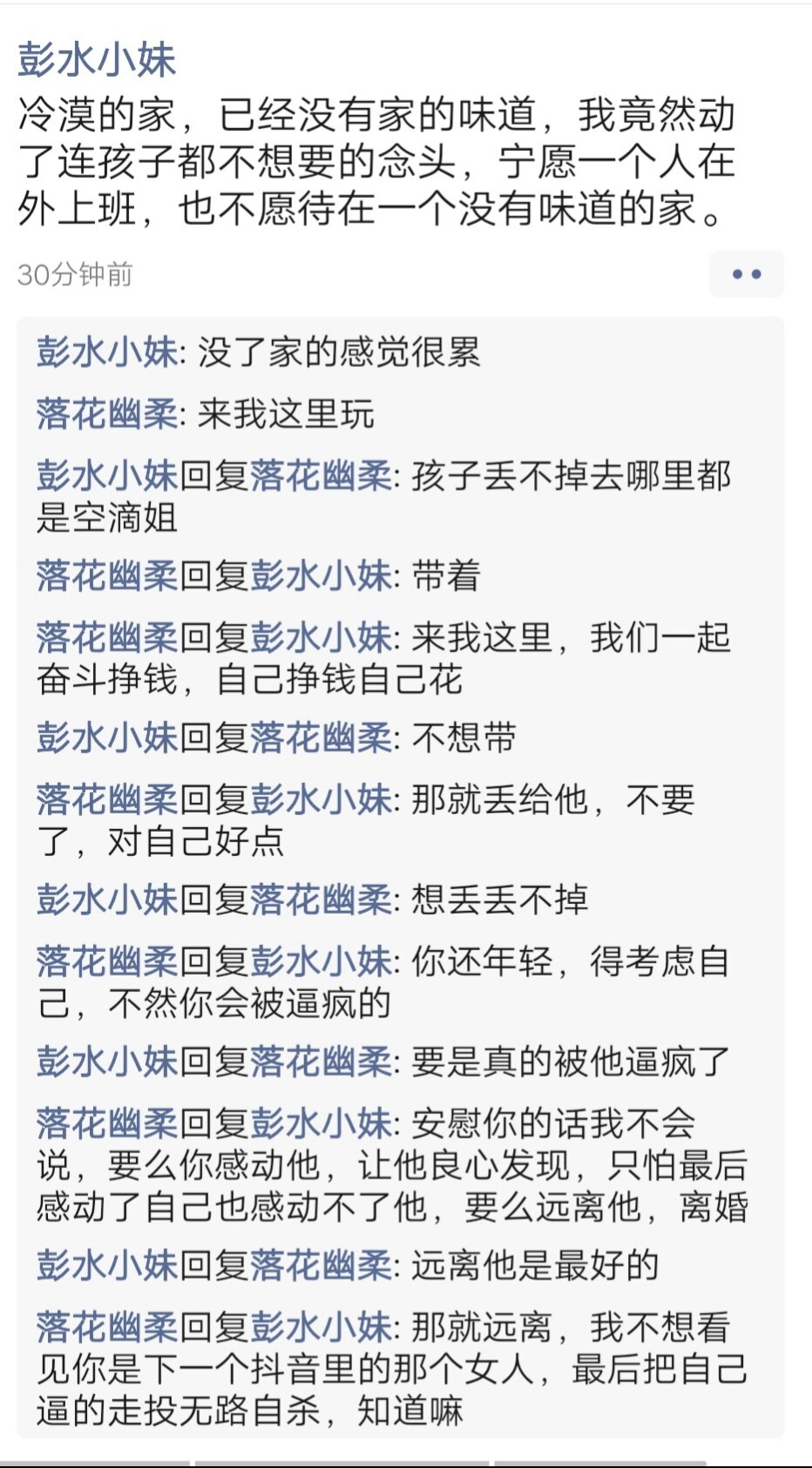女人主要还是自己要强大,包括心理、身体、经济,否则对于结婚,甚至谈朋友开始就不工作的女人,除非自己花容月貌,或者遇到一个除了这个女人就活不下去的男人,否则,结果就如截图中的女人一样。