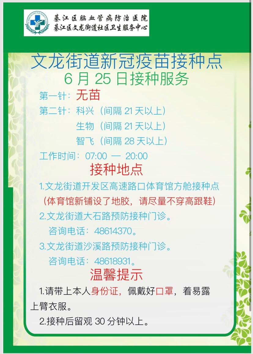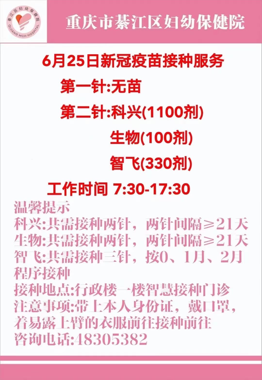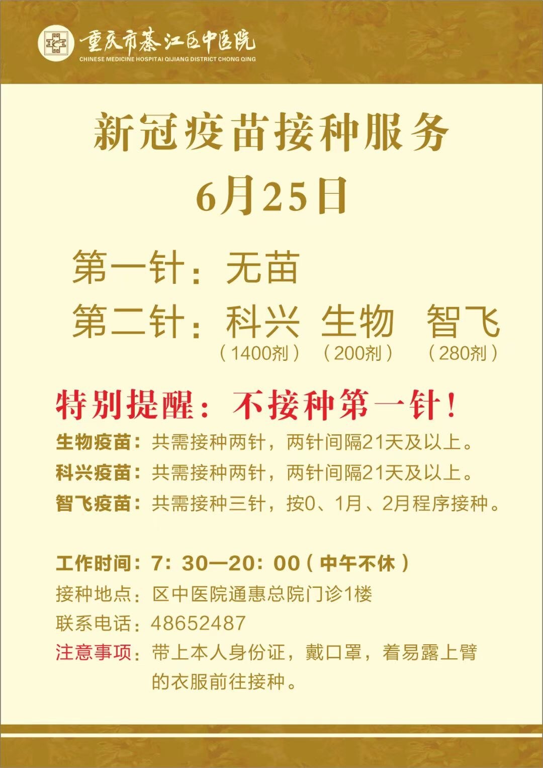 綦江区中医院,今晚会到科兴疫苗1400剂,仅用于第二针接种,明早7:30开始,中午不休,请大家提前通知安排,带上身份证有序接种[抱拳][抱拳][抱拳][抱拳][抱拳][抱拳]