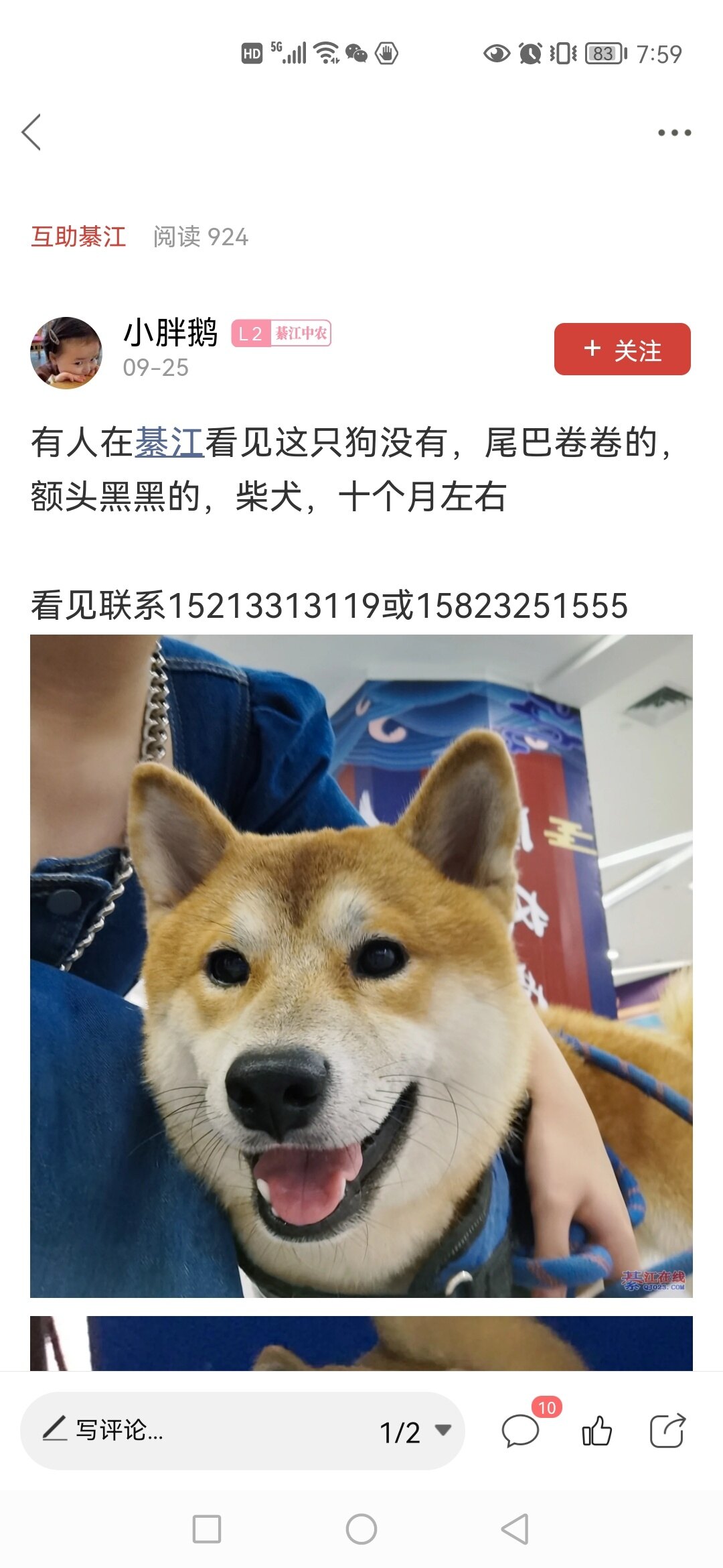 你好请问可以留个你的联系方式吗,或者打我的电话15823251555。这是我家的狗,走丢了女儿哭了好久我们一直在找。