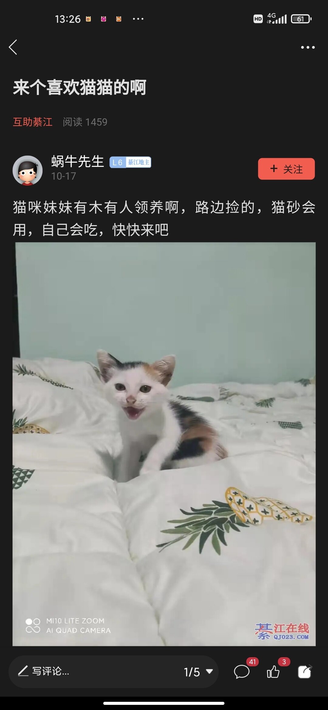小区好几个都看见的,还问是那个的猫,猫跑我们前面,跑到广场旁边那个铁桥就在桥上没跑,我们就出去了