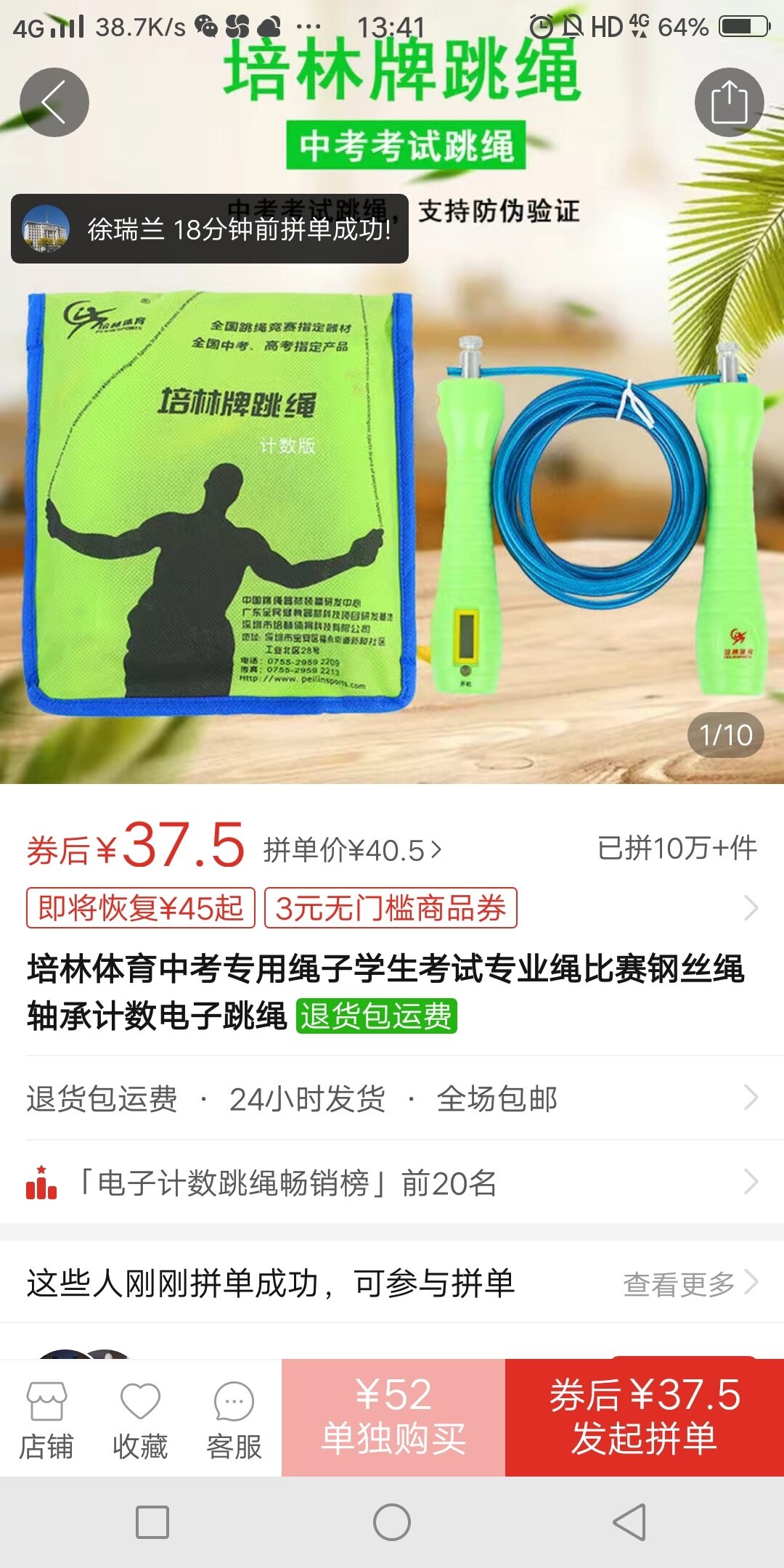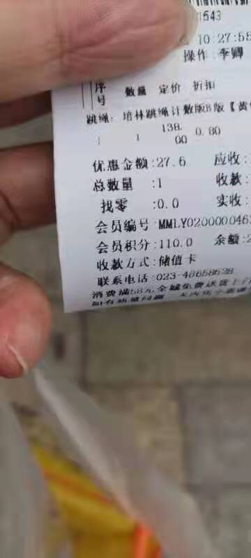 海棠书店前几天跳绳断货了,我在蓝月亮买的培林计数跳绳原价一百三十八元,打完折还一百多元,早知道海棠有货了我还省几十块