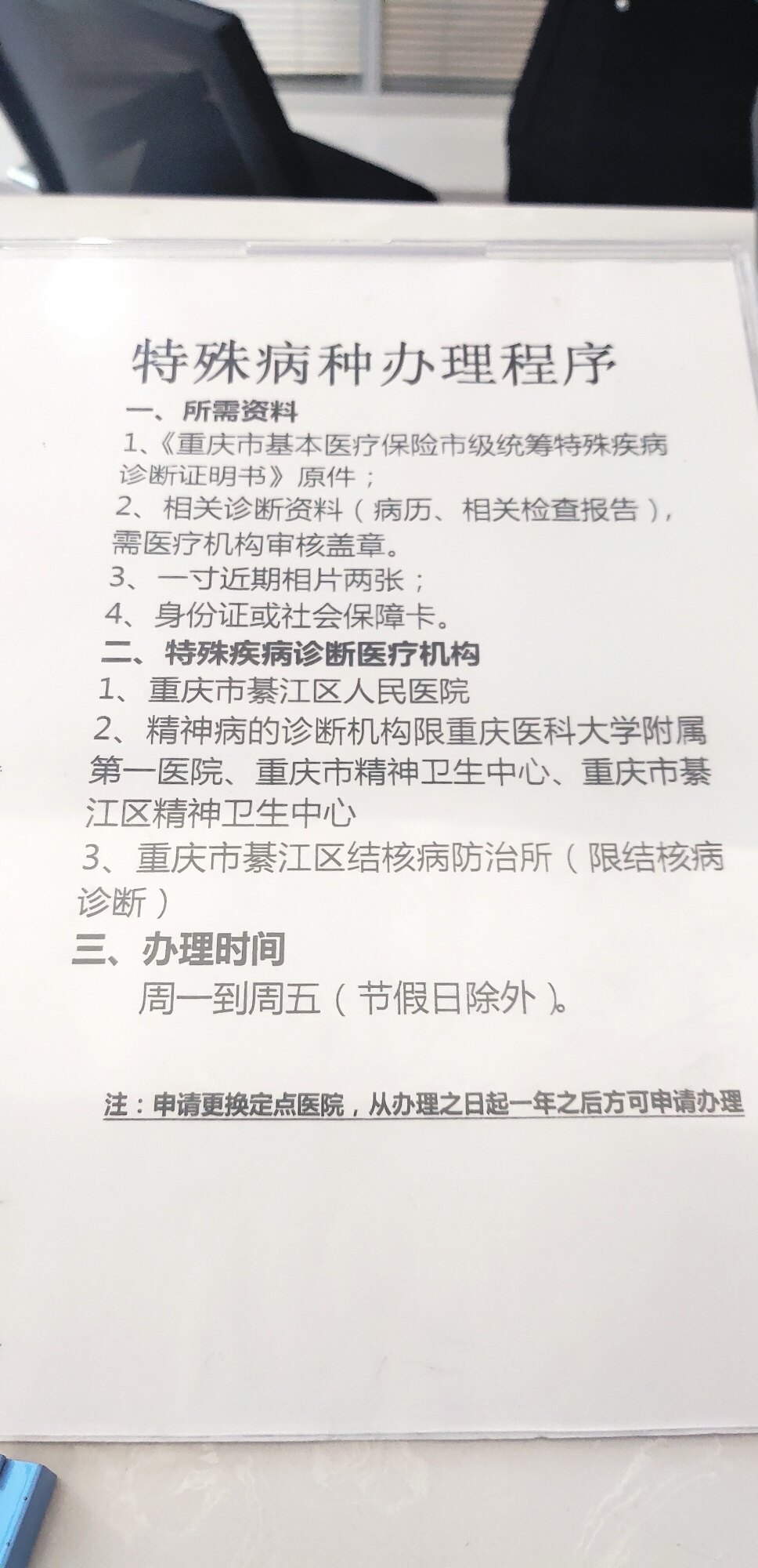 如果是高血压,糖尿病,可以直接在社区医院办理,如果是其他,需要带上住院病历,相片,到綦江人民医院办理