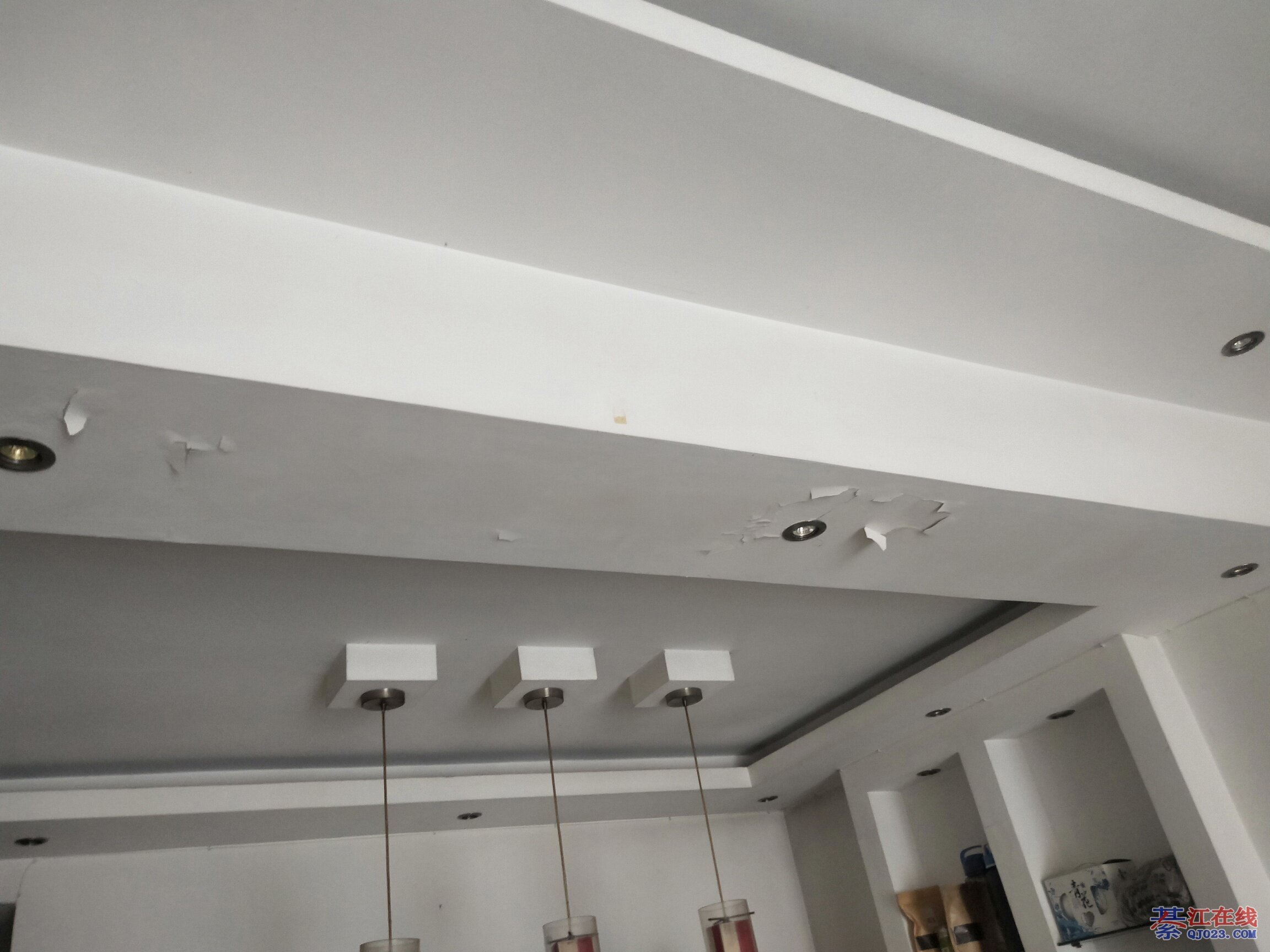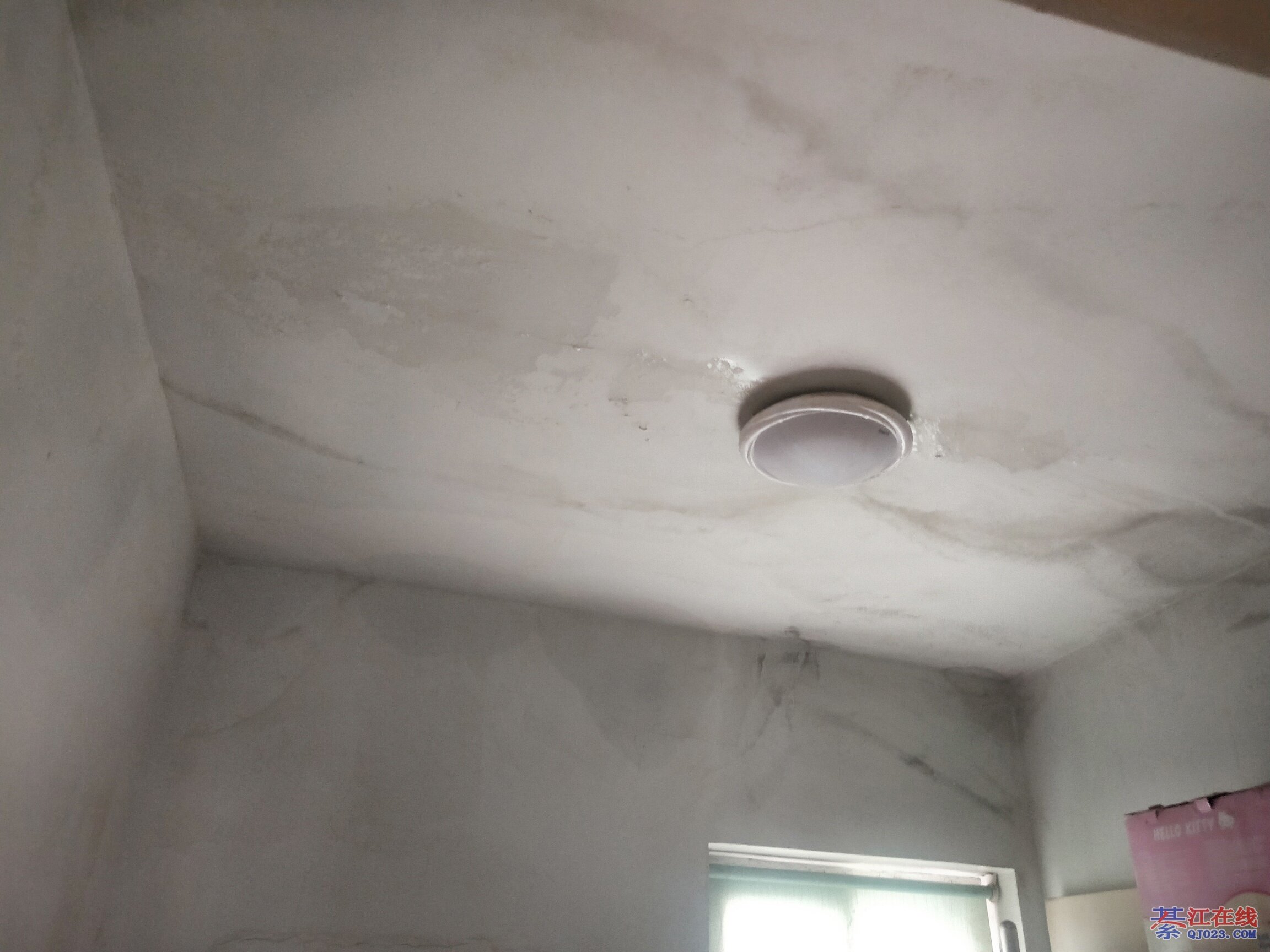 这是楼上水管漏水了,找不到漏水点,管子应该走的地上,应该是自己装修的吧。找专业仪器来找漏水点。敲地砖修补