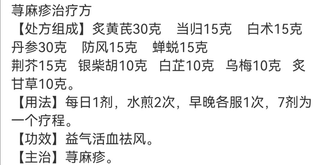 他是慢性荨麻疹,一发就一炳炳的,一团团的红肿,发痒,越痒越抓,越抓越红肿,也是住院出来停药又发,没办法了找的土方法,结果好了……