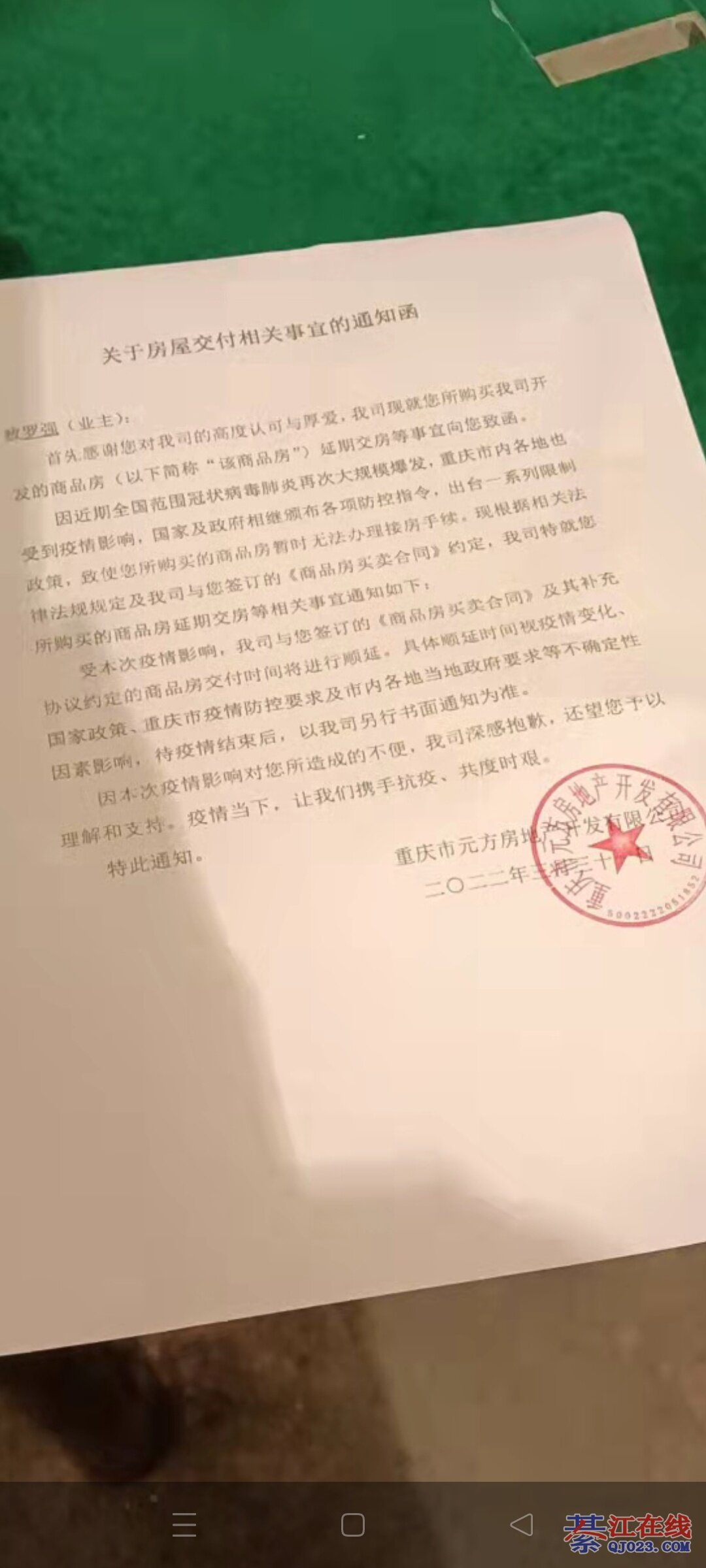 我也收到了,重庆现在疫情控制的还好,只晓得拿疫情说事,但是前两天他们在动工的哇,就剩外墙和门窗了应该能交哦