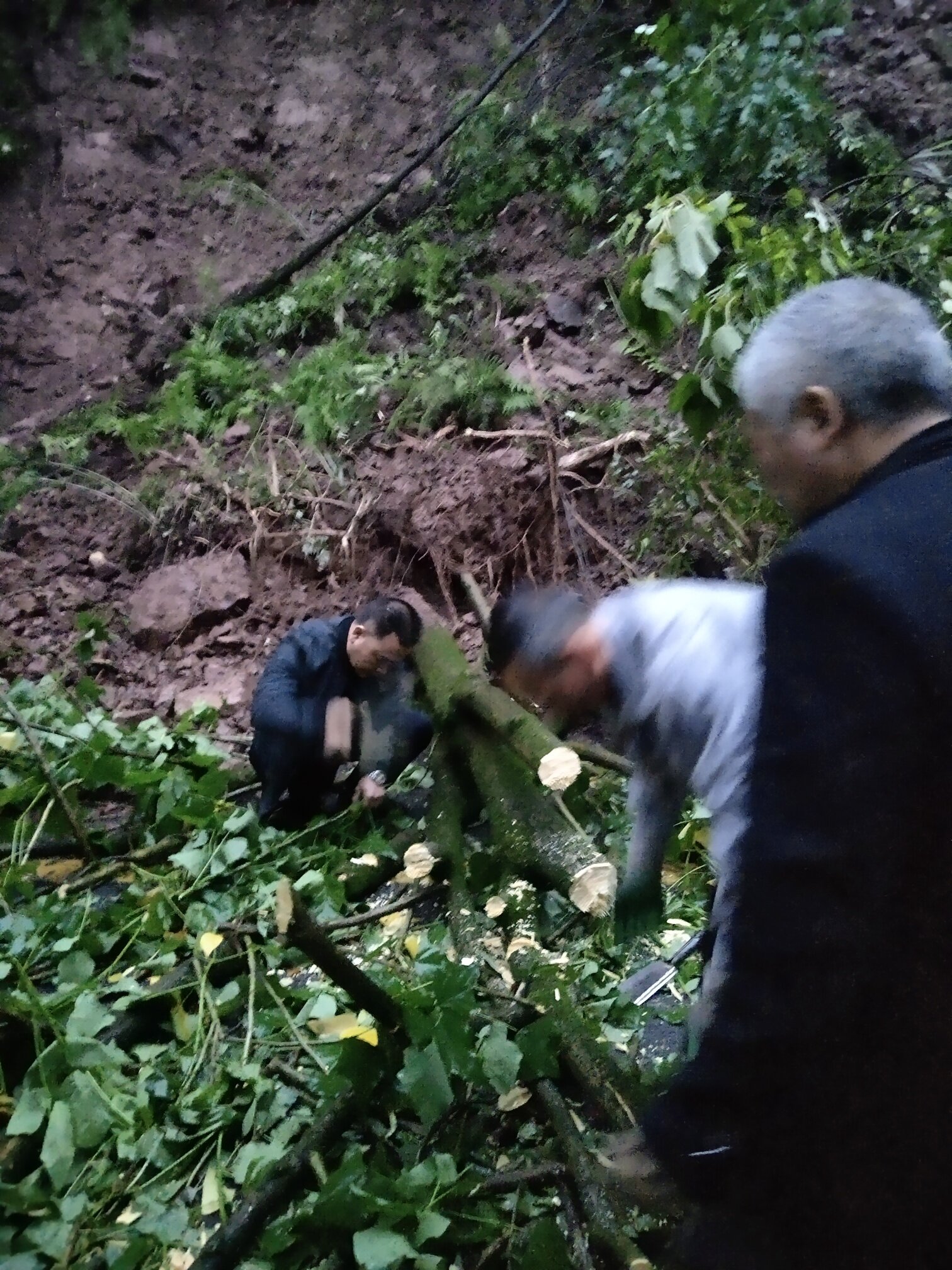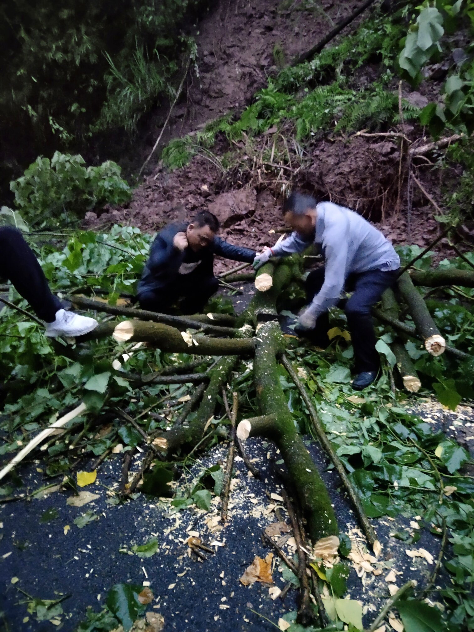 满树的荆棘刺巴,扎进肉里,鲜血直流,但大家反而斗志昂扬,热情不减,就用麻布当手套,搬开树枝,小雨打湿衣服和裤子,大家都没在意,过程中,不断有司机师傅加入,最终在大家齐心协力下,一个小时内便开出了一条道路,最后大家便默默离去,没有鲜花,没有掌声 ,一切那么的默默无闻,那么的井然有序。一场发生在凌晨五点天未亮的爱心接力,虽然发生的突然,但大家的热心帮助却让这一切快速的平静解决,让人感慨。