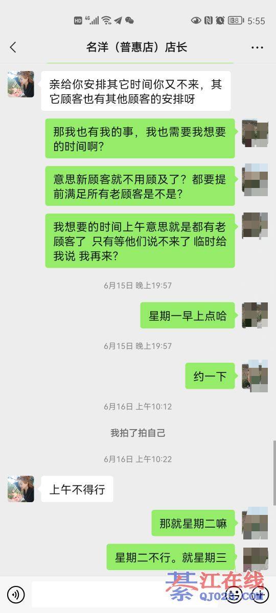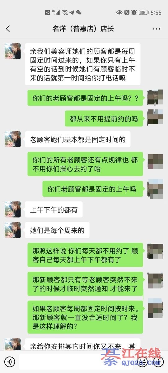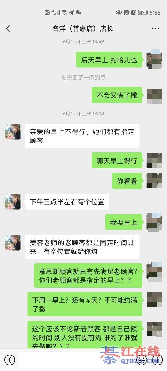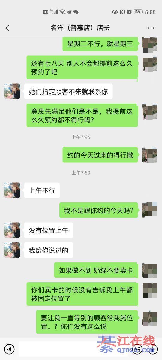 首先来个自己介绍,我是名洋几年的老顾客了,有些事情不能看一面,凡事都有双面性,当时正好我在她们家做护理,具我所知,约好了,楼主第一次去的时候,带朋友一起去的,做了一个面部保养,她还想再做一个肚子,那个美容师说后面的顾客约起时间的搞不羸,一个项目做了,别个也差不多吃午饭了,楼主一直强烈要求要在做一个项目,请问如果你们是美容师会给她做吗?更何况后面那顾客也是几天前就约好了,她们那点都一般都是一个星期护理一次,像我平时去,走的时候我就约好下周去的时间,别人也好安排时间,我自己也可以安排时间。