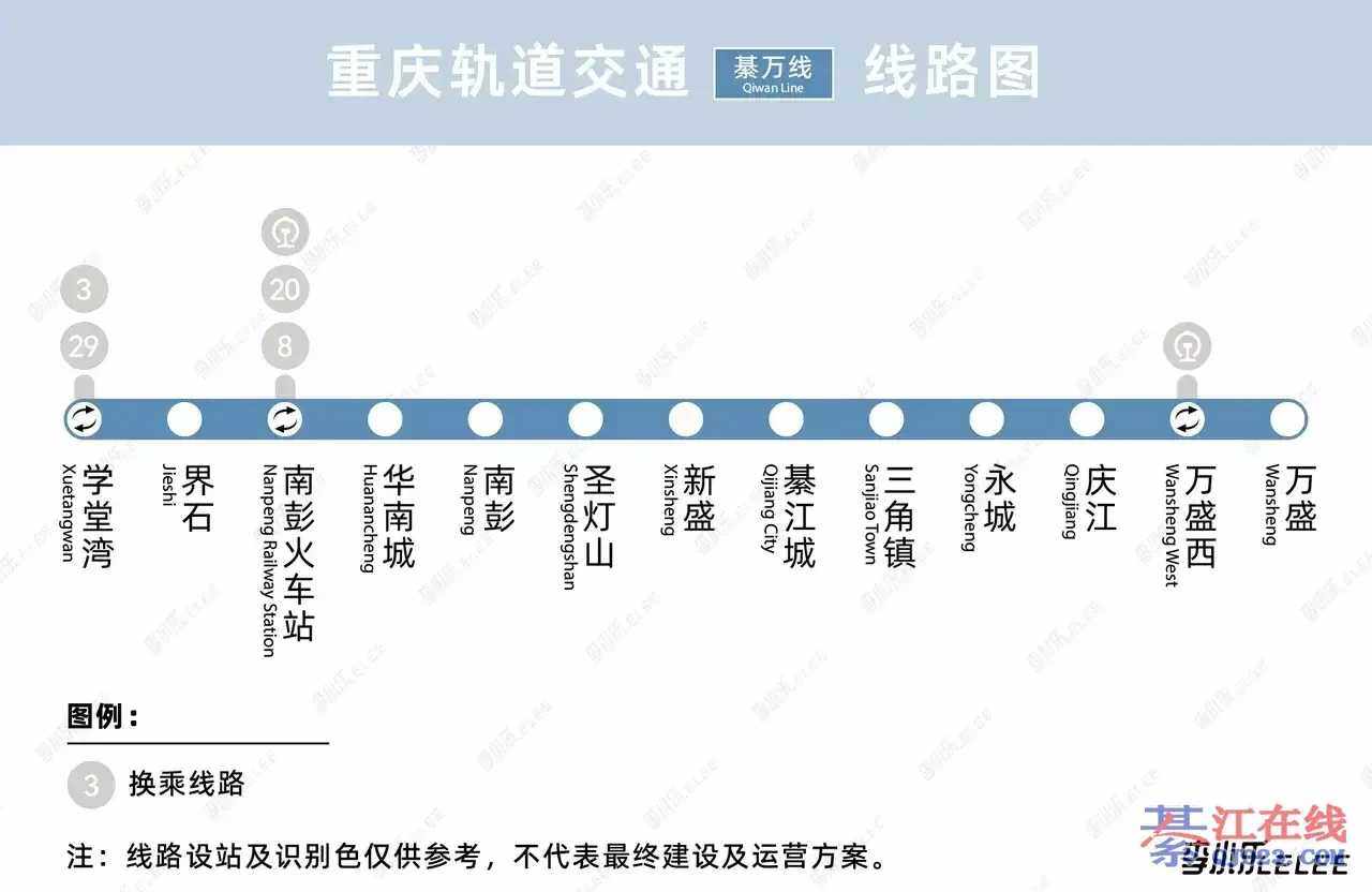 綦江设站:綦江城区北站,经通会,三角设站,永城设站,庆江设站,万盛支路设站终止万盛城区站。