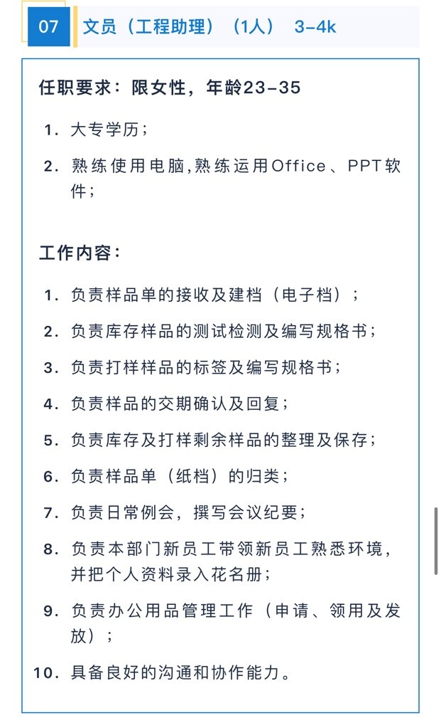 撒子公司哦,真是拿人不当人用哦。给那点工资又要别人技术好,检验丰富,还要做牛做马。看那文员才可怜哦。3k的工资,还要管样品测试和编写规格书。库存也要管,会议也要管,员工,耗材都要管。你的钱是美金迈?