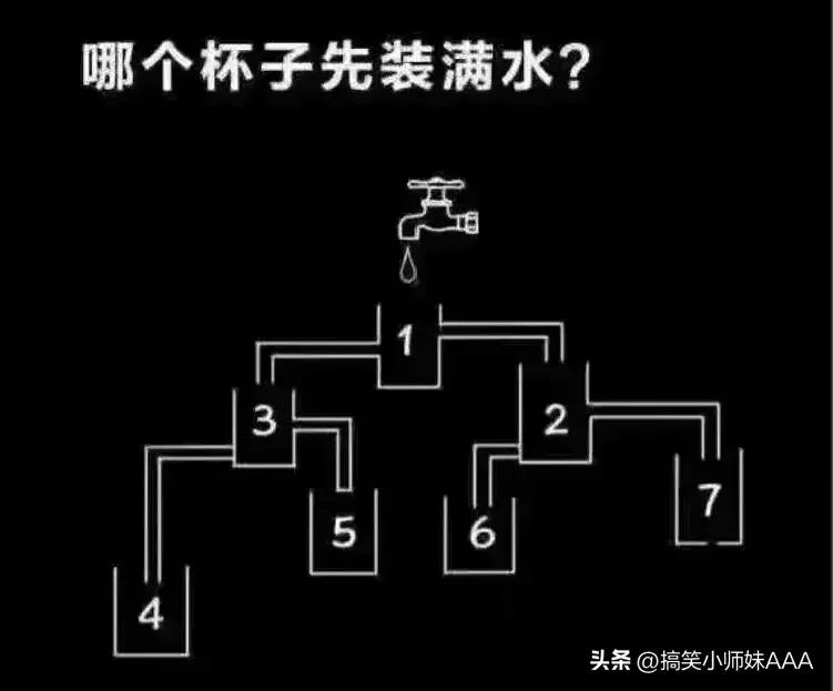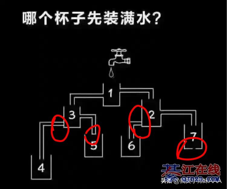对头永远是3号!只有三号能装满水因4.5.6号根本就不通!2号和7号再多的水也漏完了!1号比3号高所以最终只有3号可以装满水!