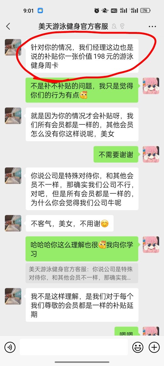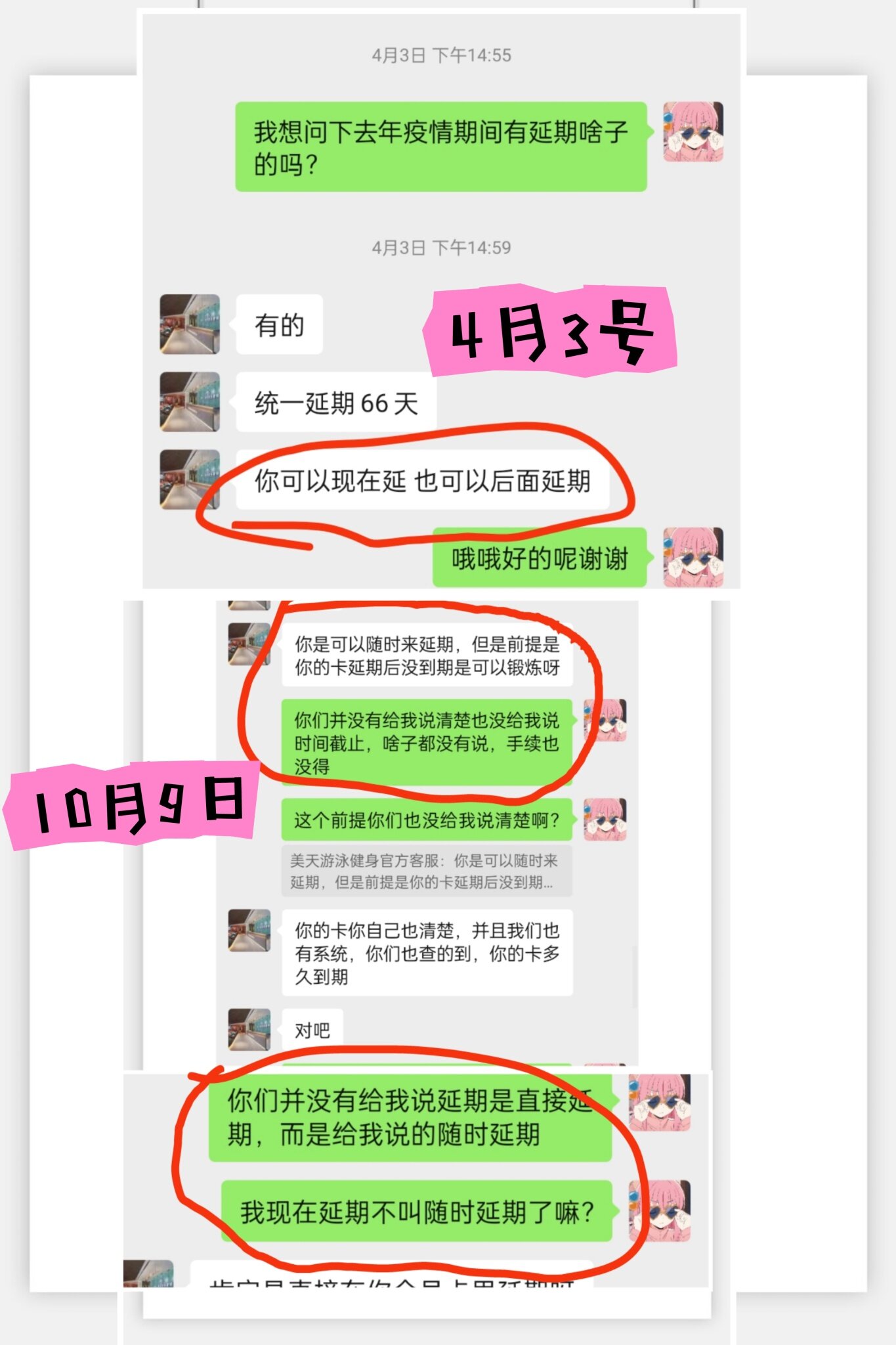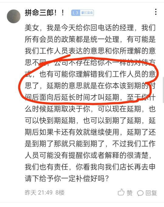 什么时候延期是本人过来前台给你操作,你可以现在过来延期,也可以快到期过来延期,也可以到期了以后给你延期,你过来了又没有喊前台给你操作延期,所以前台就没有给你操作,如果你非要说没有给你自动延期一说,目前操作系统还没有这个功能,所有的会员都没有提出这样的问题,我不知道为什么你非要认为你所认为的,你所认为的你随时来从你来的那天开始算“延期”,那个不叫延期,那个叫赠送你66天或者叫开卡66天,不叫延期,延期是向后顺延叫延期,我们前台从来不会为一个会员去区分对待。你可以到公司里面我给你做申请补偿,还有我们客服前台人员也是工作,没有必要给你所谓的玩文字游戏,也没那个必要,公司谁会为单独你这个事情给你玩文字游戏?你心里不舒服我很理解,你到店里面来,我向公司申请给你一定补偿呢