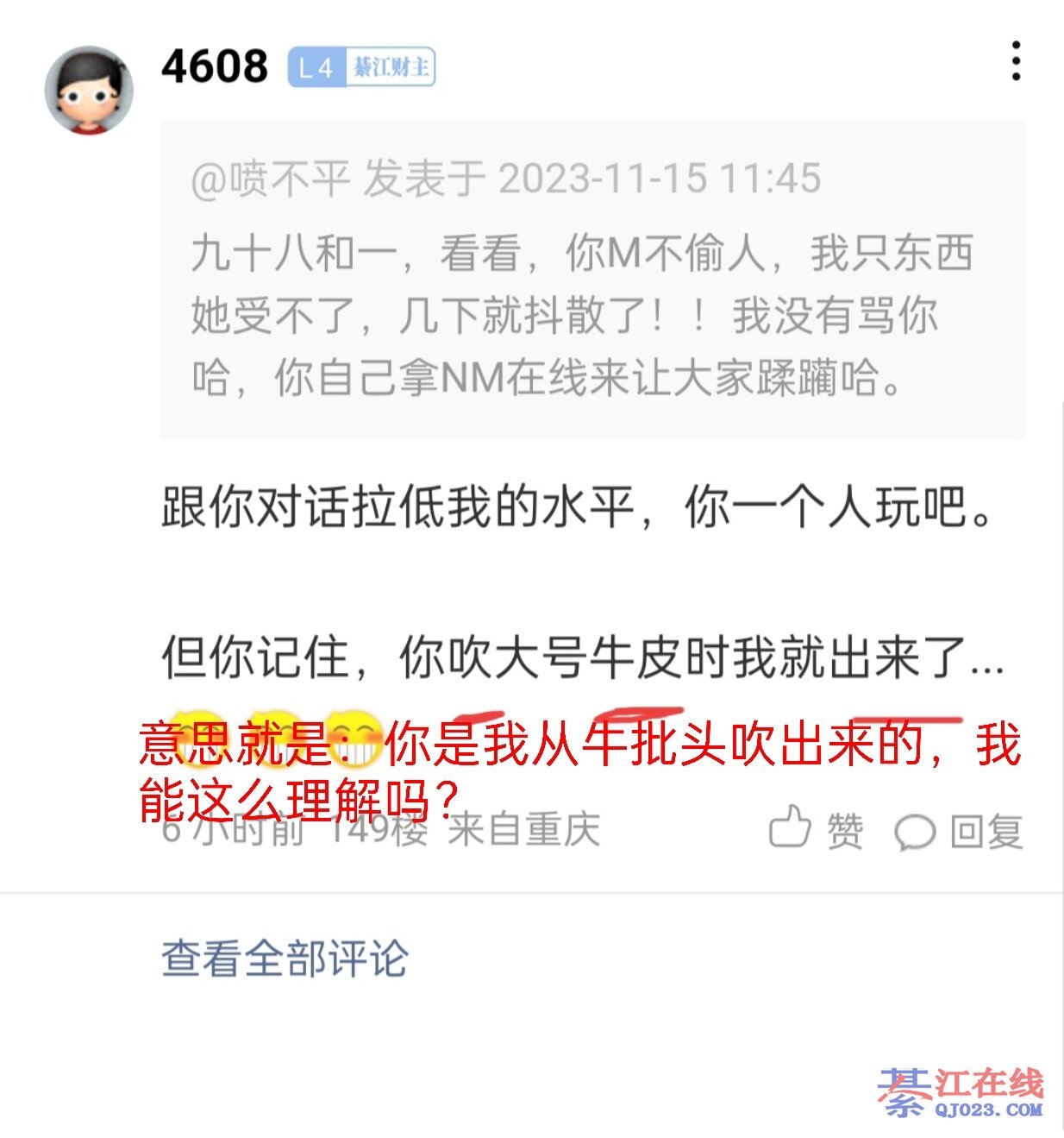 娃子啊,我就说了几句事实,你生什么气的?你不就买菜煮饭带娃儿...哪点说错了?让你努力一点怎么就冒火的?哦,我把你的牛皮搓破了你就输不起了?你平时不吹不就完了?你各人回看自己吹过的牛皮,真一点不脸红的?什么养蜂,酿酒,养猪...什么中专电脑毕业...什么捐一万块钱,什么成立自暴赶屎队...你从不反省从不回头看的?