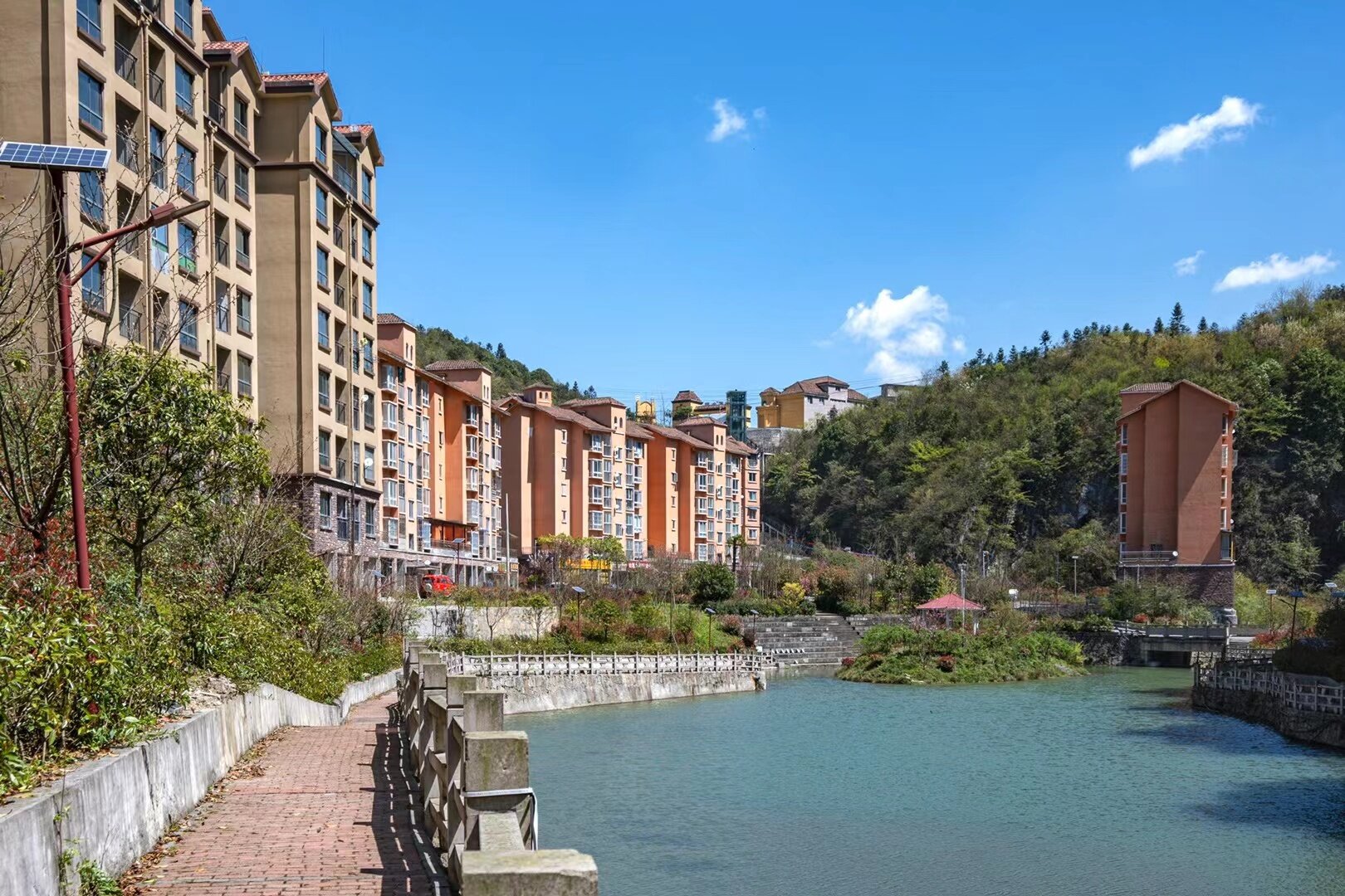 习水跟綦江交界的地方,小区内海拔1360大门口海拔1460,綦江高速1小时15分钟,动车到桐梓北有班车上去。避暑的旺季车次多点。小区内前面是亿年溶洞,后面是水库。不担心缺水。