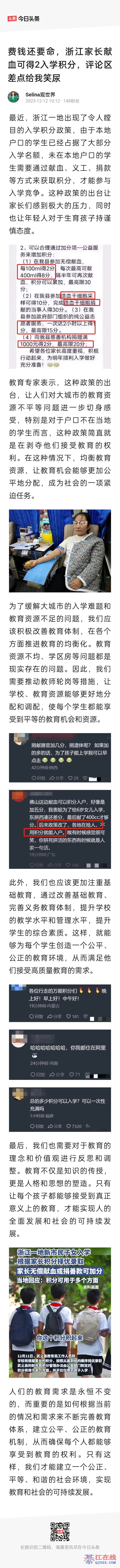 现在我突然觉得大家都去献血是好事。因为你们都不献血,他们就要开始养血奴了。浙江那边家长不献血娃儿读书都难了。所以大家以后还是不要说献血不好了,否则下一个血奴可能就是你我了。跪着喊一句“皇恩浩荡”。