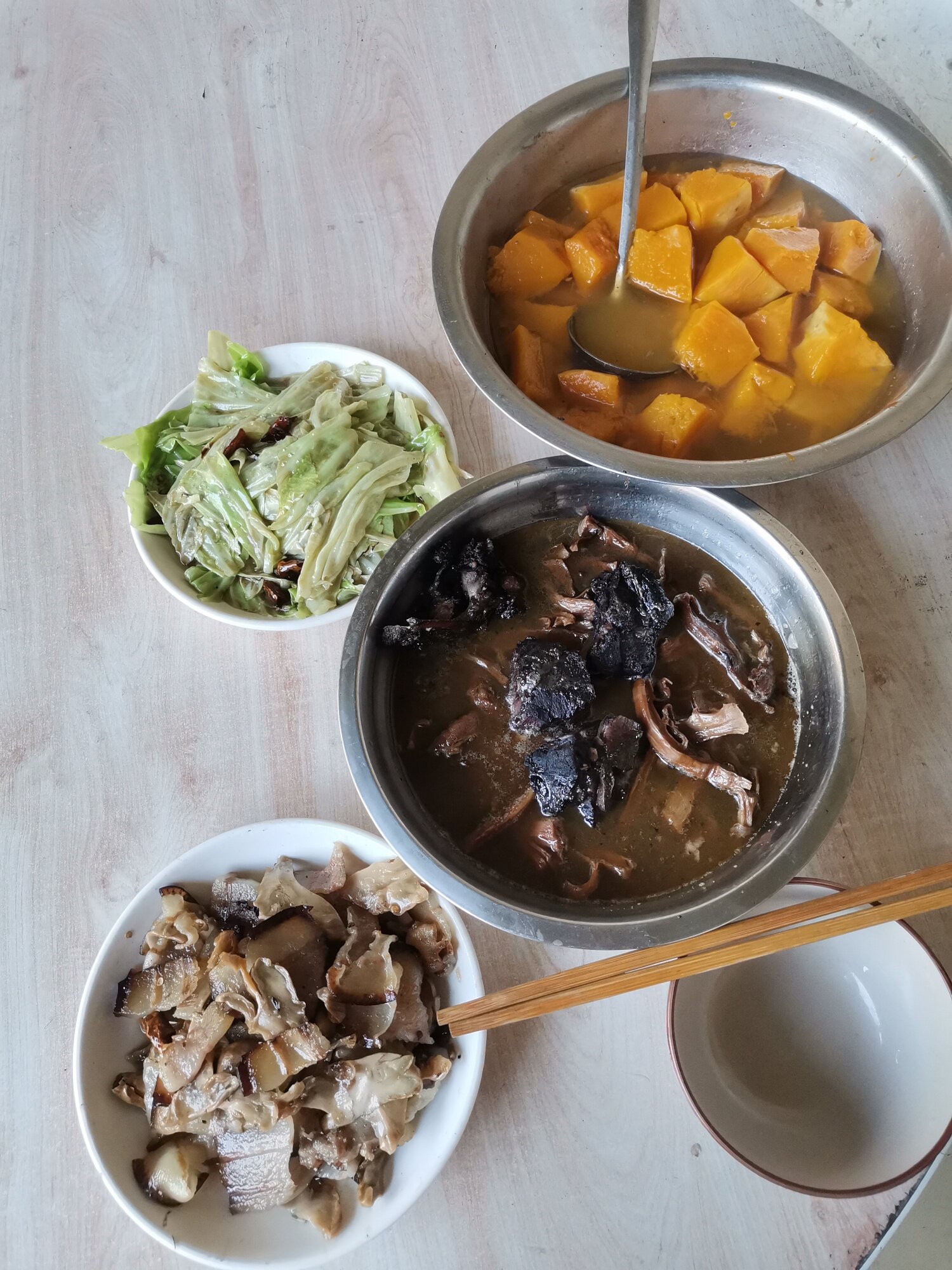 半个月前我一个人逛了一下,水库里面有两家人住,夏天是做农家乐的,到里面十二点,和他们吹牛然后进厨房看他们炖的腊骨头炖干笋子和老南瓜汤,一下子就感觉好饿,我说我没吃饭和你们一起吃多少钱我给钱,说平时都是二十元一个,我说要得,结果又给我炒了白菜,腊肉炒干儿菜片片,二十块钱还单独给我摆了一桌。搞得我很不好意思吃了三碗饭,菜都差点吃光了。说实话,那顿饭吃的非常美味。