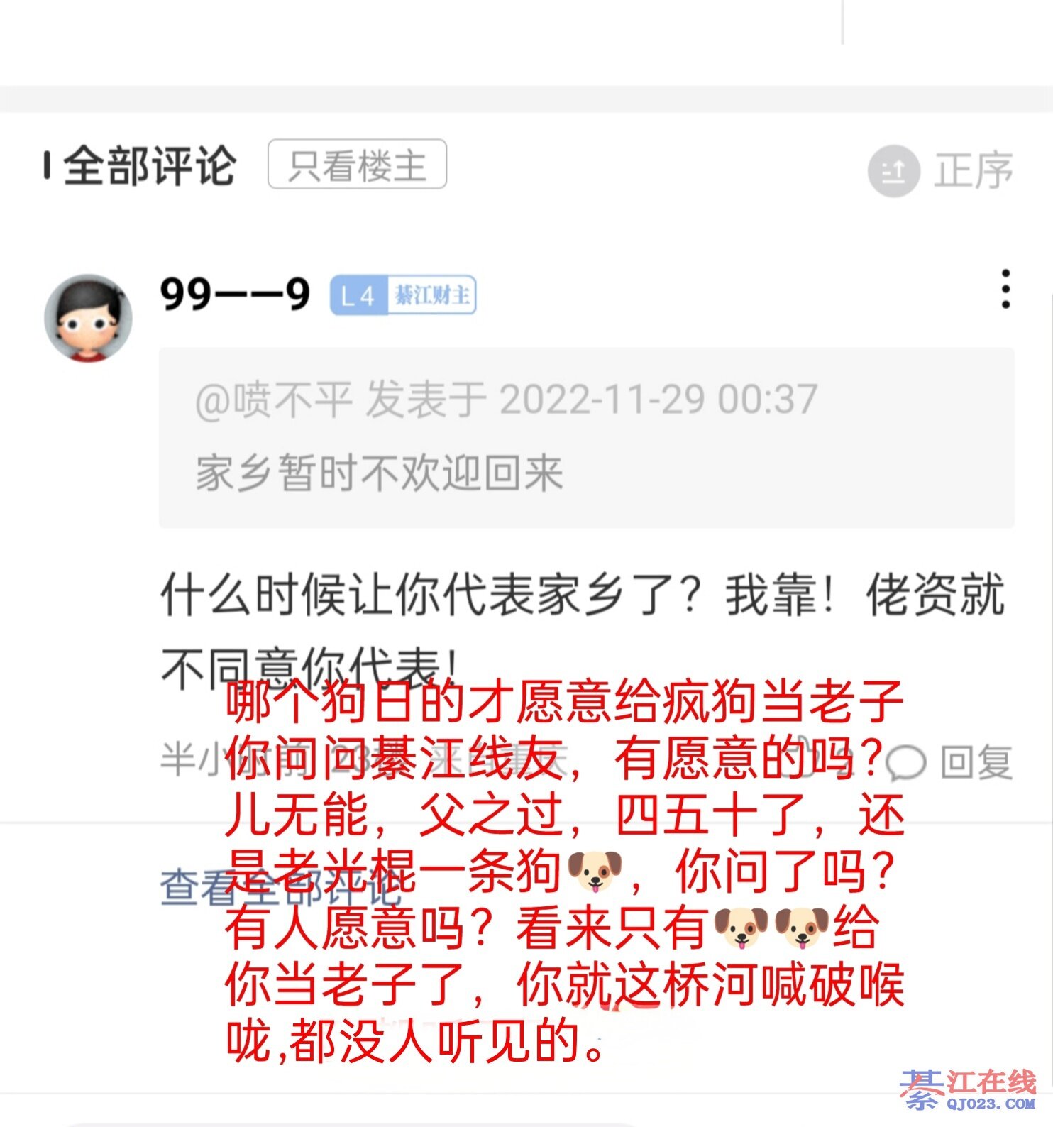 喷娃儿,你要玩地域黑,那重申次:佬资代表有尊严的綦江人,开除你个龟壳的綦江藉。 搞笑的是你自己已然承认...成万盛人了?其实有误,你最多算万盛的土包子,土狗子...到处没人认的