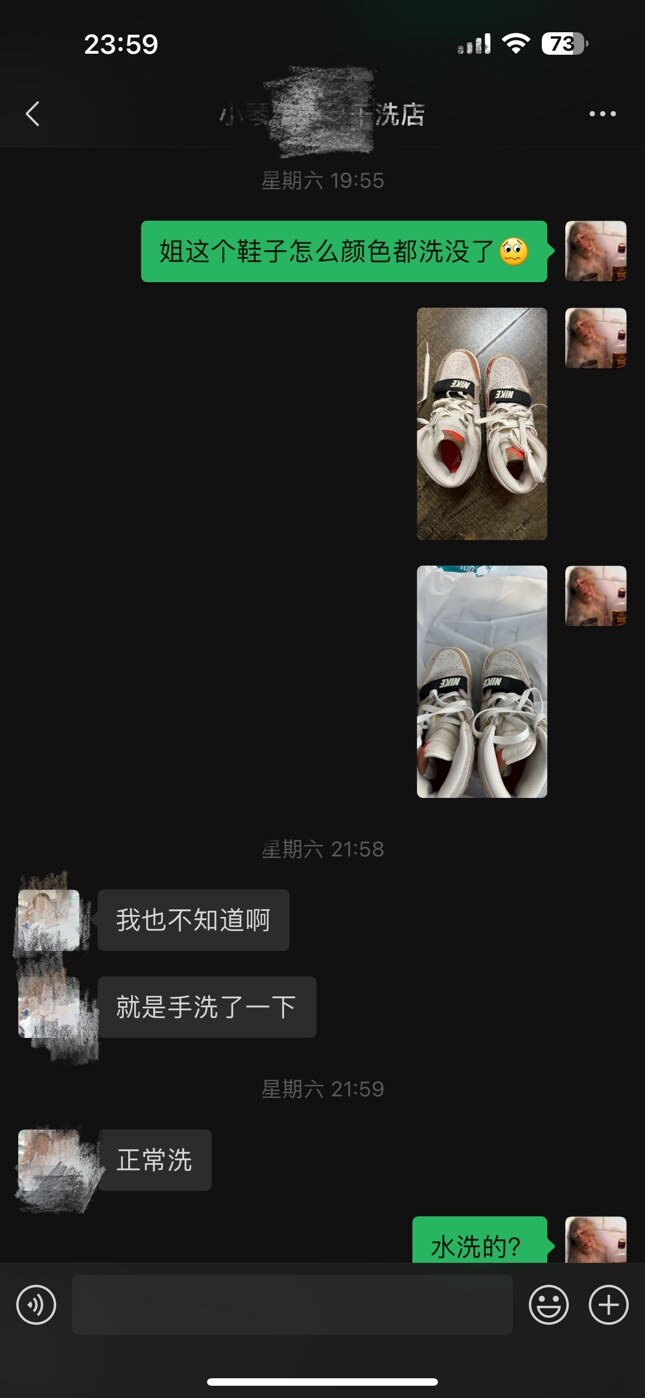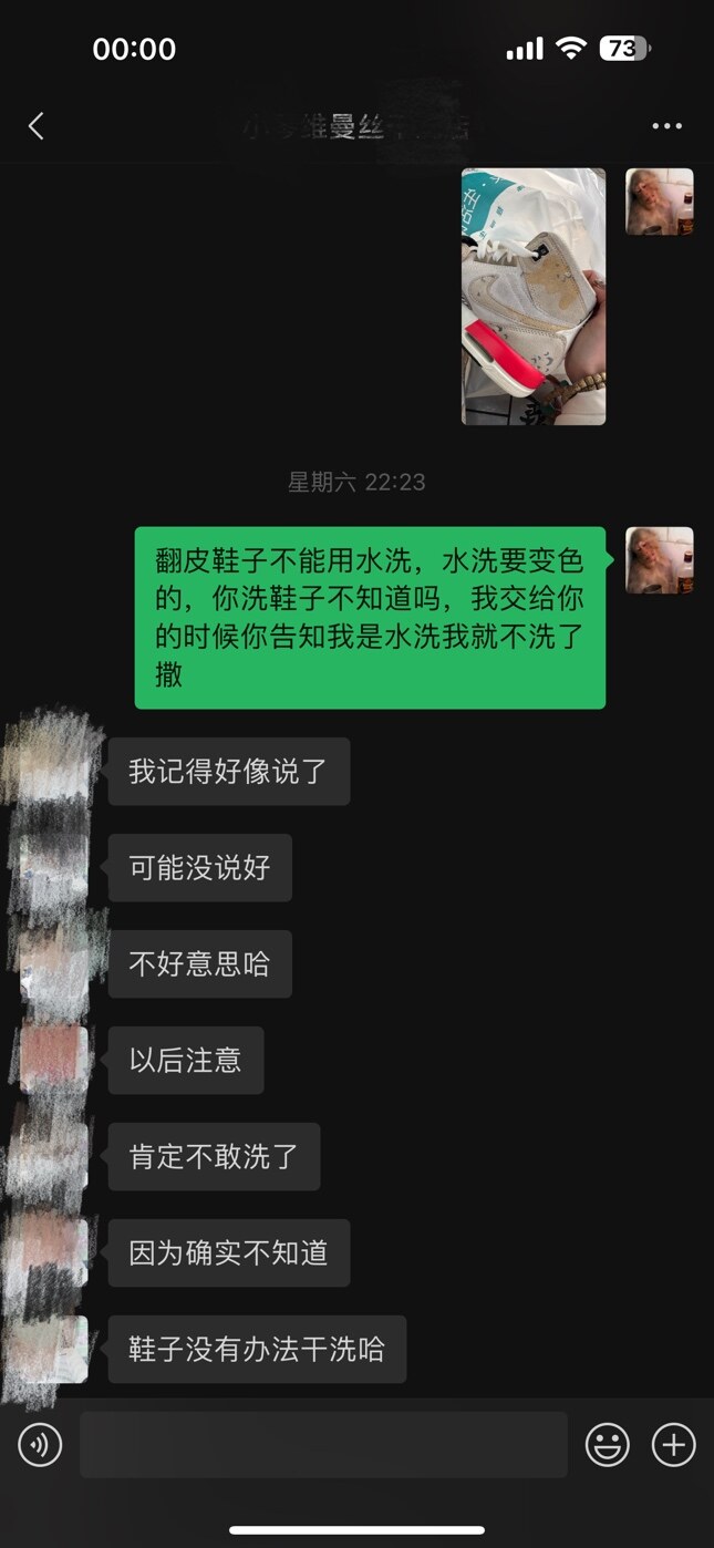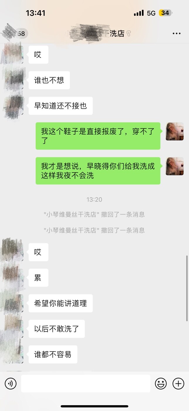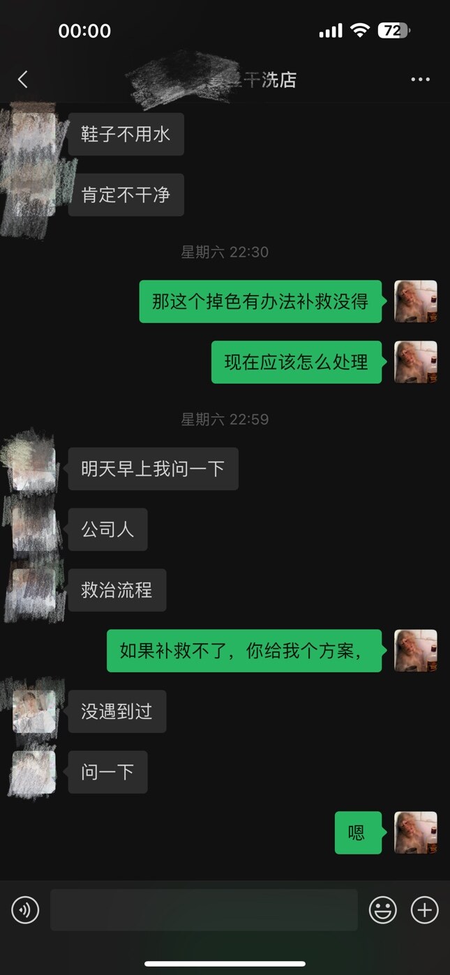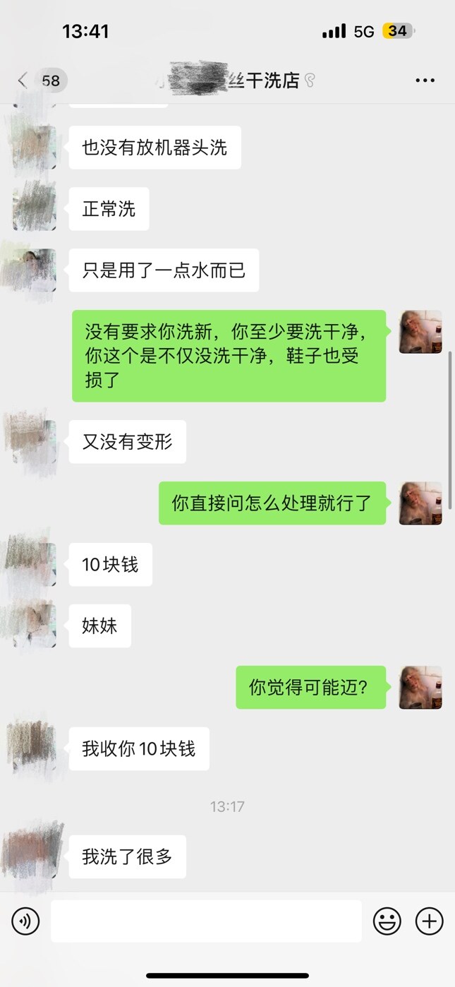 以后建议自己洗,自己用心爱护,拿去外面本来就做不到一对一的专业。其次,你们并没有商量解决方法,你也没有提出你想要的赔偿方案,所以她说再好也没用。最后,她老公住院,发这几句就是抱怨这些天遇到的事,只希望你理解一下,脑溢血会面临死亡,家庭就失去了支柱,她全身是走肉的,并不是说她要死要活的赖着你,这点你反复强调的话,你不是像消费好几百买鞋子的善茬。如果真用了化学剂不该这样洗又另说,真是普通水洗反色这么严重,你该怀疑的是鞋子质量,难道下雨就不能走湿路了吗?有格局、大度的人不应该这样计较,穷人的思维有局限性也挣不了这么多钱买!个人观点