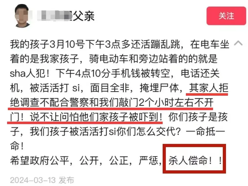 那孩子死的太惨了,除了面目全非,头骨被打粉碎了,还没死就被埋在了地下,孩子肺里都是土,可想而知,孩子当时该有多痛,多绝望,希望这种悲剧不要重演,家长多教导自己的孩子,受了欺负必须要说出来,父母永远都是孩子最坚强的后盾,是有能力保护他们的木瑾星辰 发表于 2024-03-18 10:58