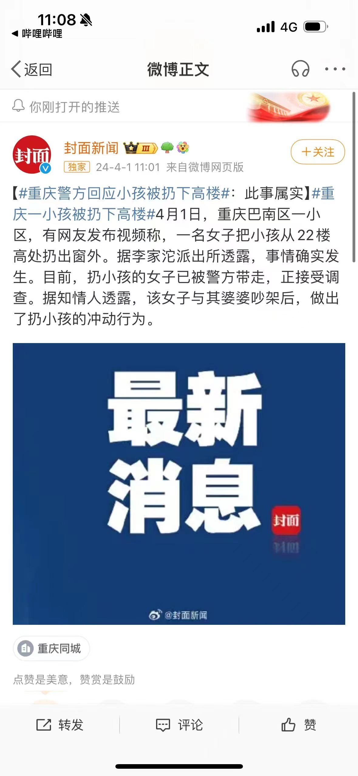 你这个视频播放不出来呢。听我老公说,丢娃儿之前,这两个大人还在吵,婆子妈堵媳妇不敢丢,结果媳妇在客厅阳台没丢,在卧室去丢出去了。