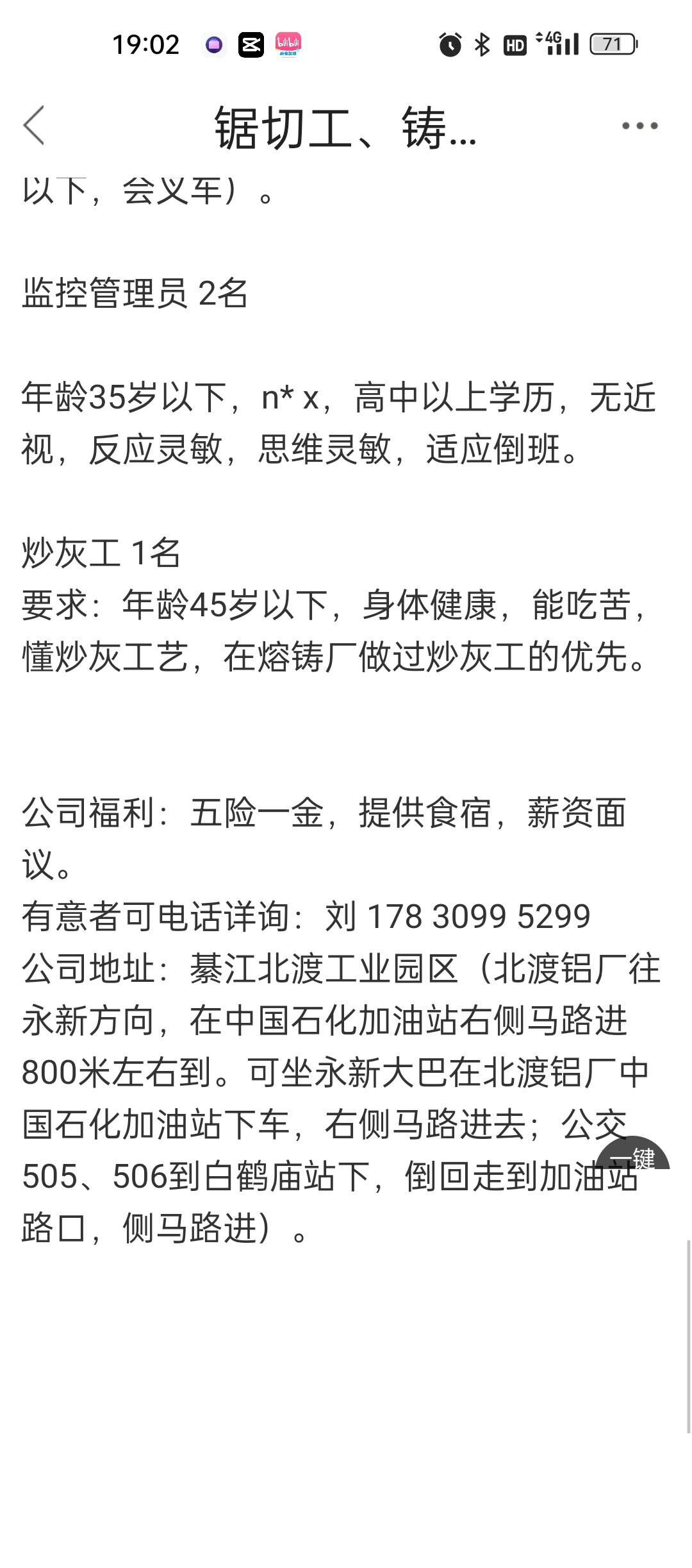北渡涂啥铝厂在招,三班倒四五千。岁数大了不要