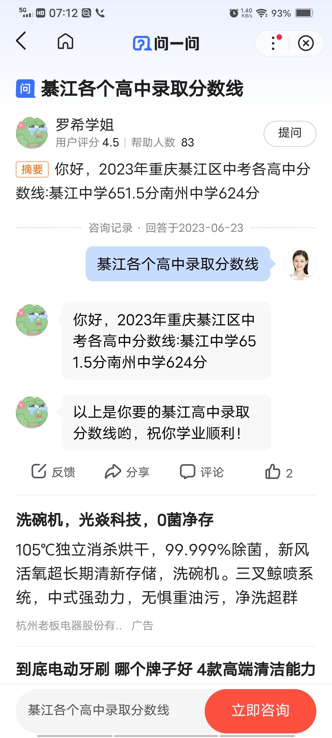 东溪二中,娃儿班主任确认今年录取分数线453。。真是无语了比去年还低