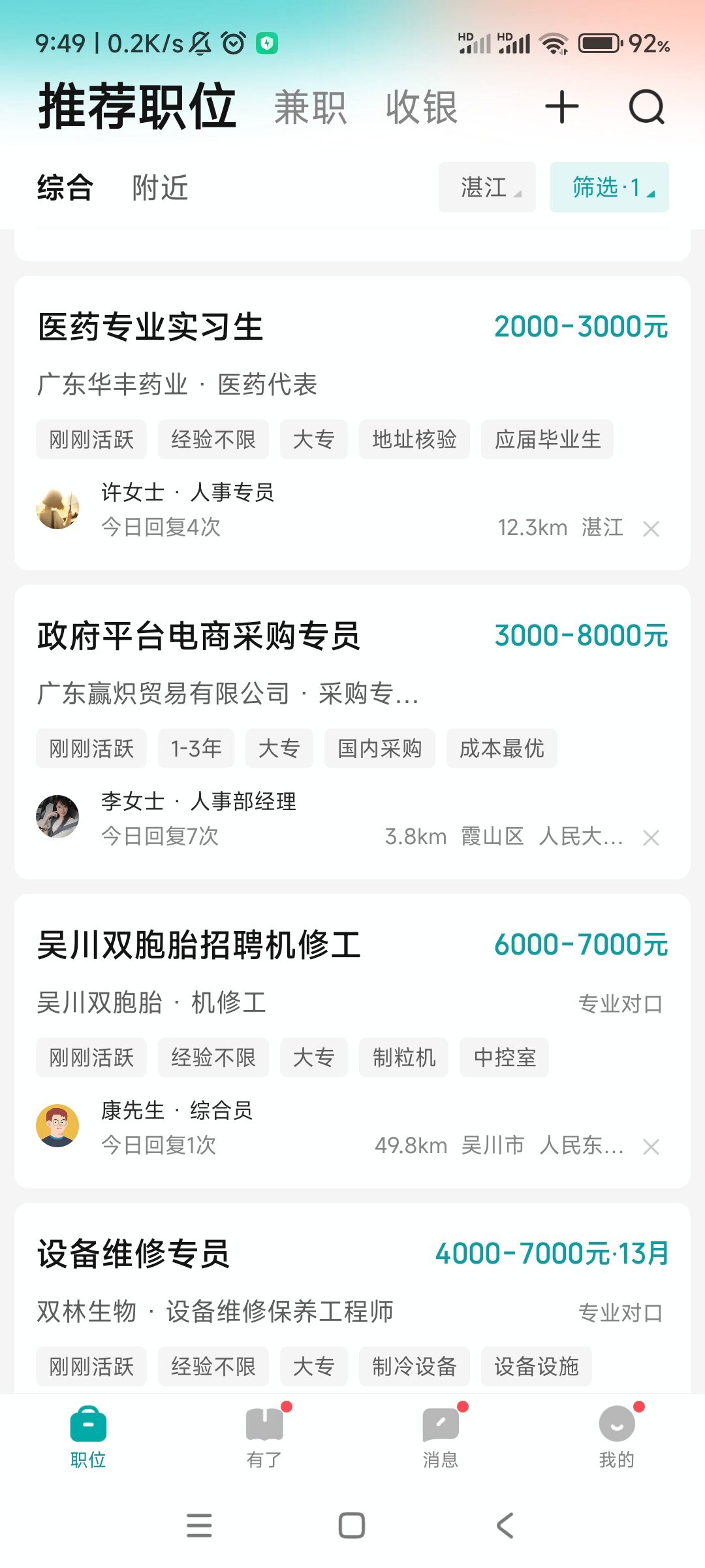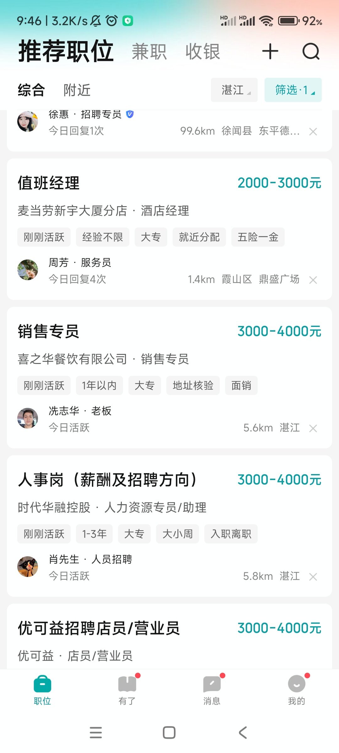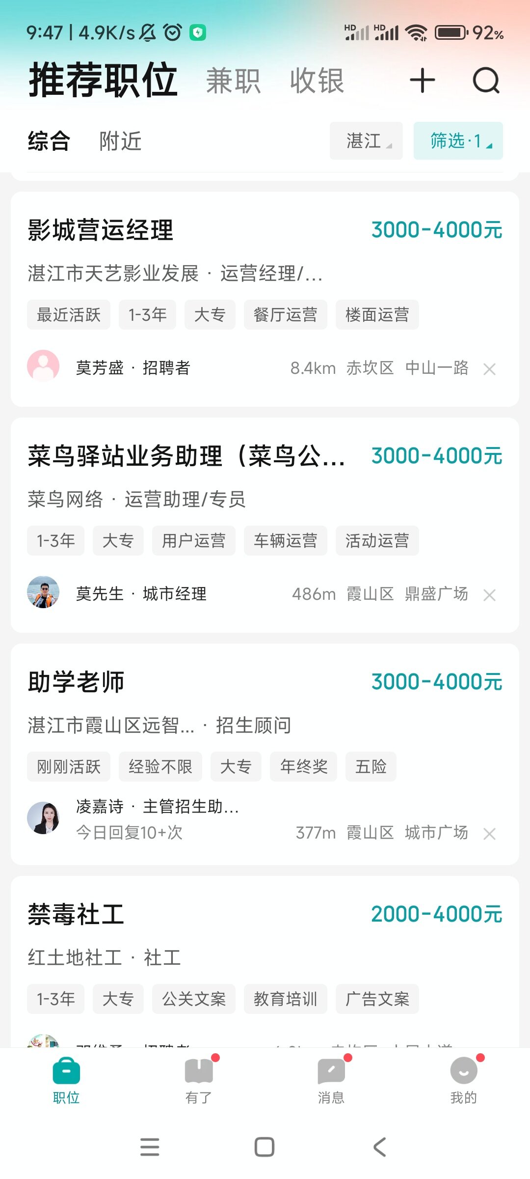 湛江比綦江垃圾,不接受反驳。只要你去那里面试,工资就是两千六百多,什么三千,四千,就两千六,全勤一百,社保?没有的,五险一金?别想了。啥都是你自费。工资还会找理由找借口扣着钱,压着几百块,说你干满多少天了,以后再一块发给你。要不然就是叫你免费试工一两天说你不合适,不用来了。