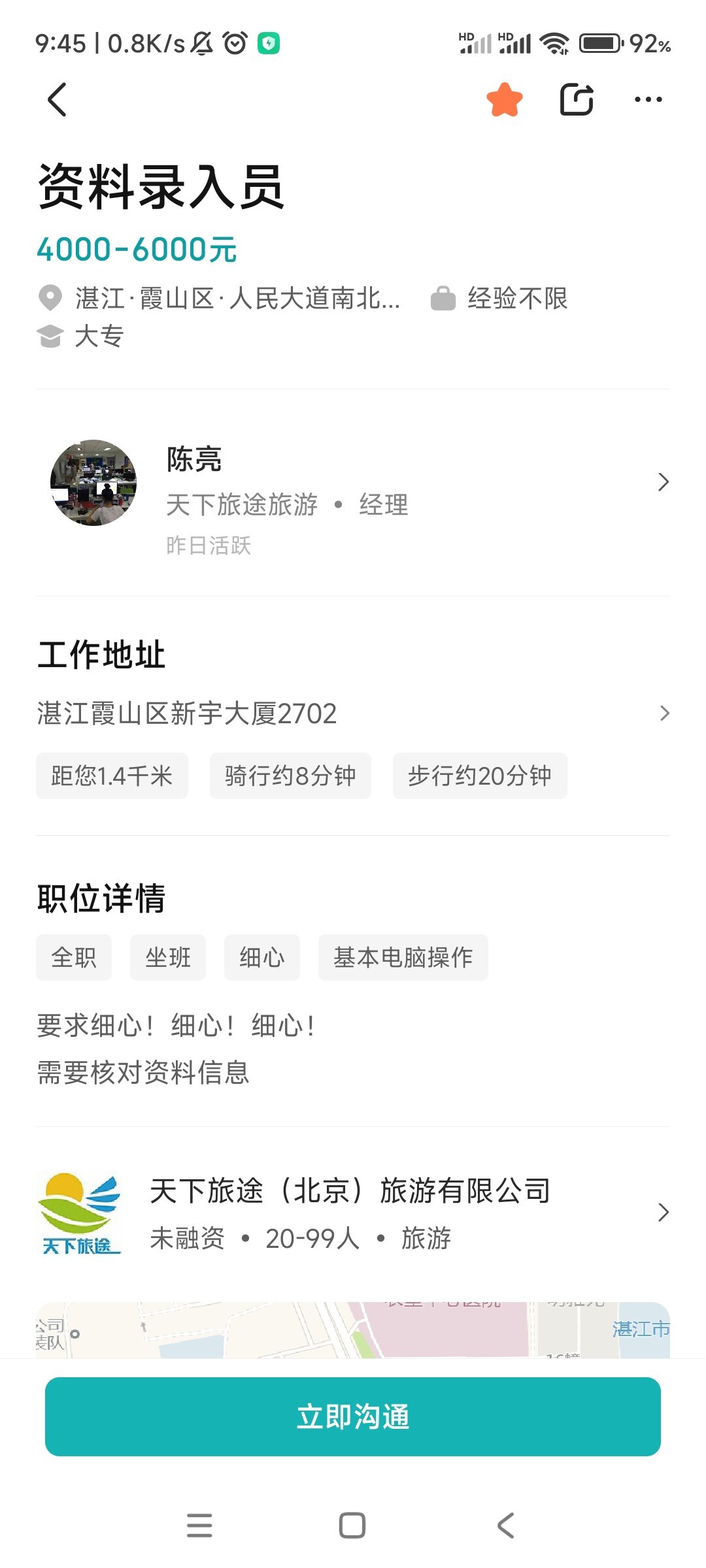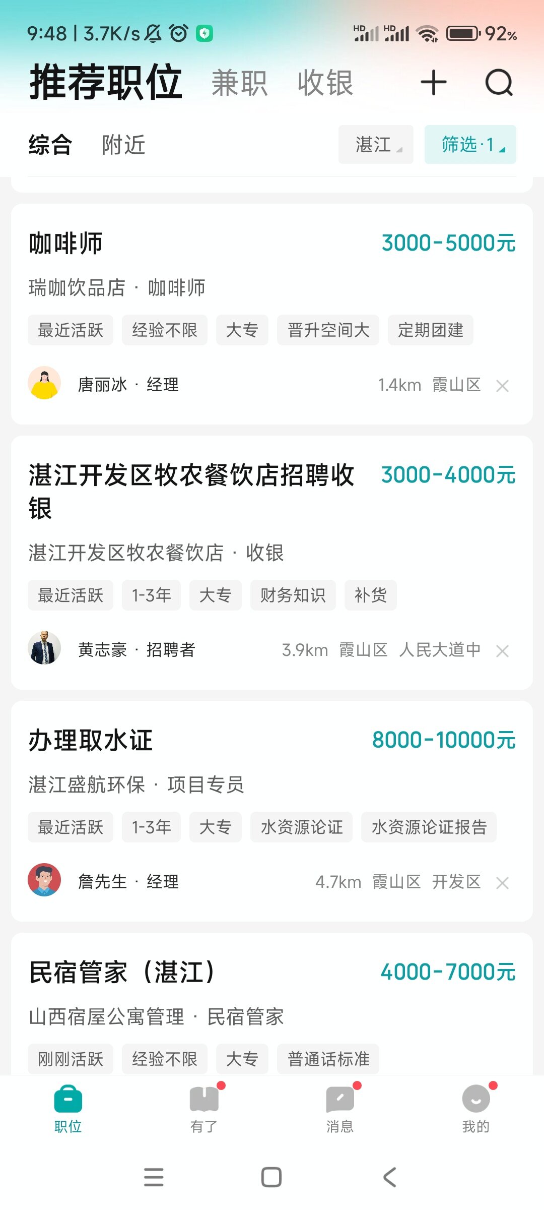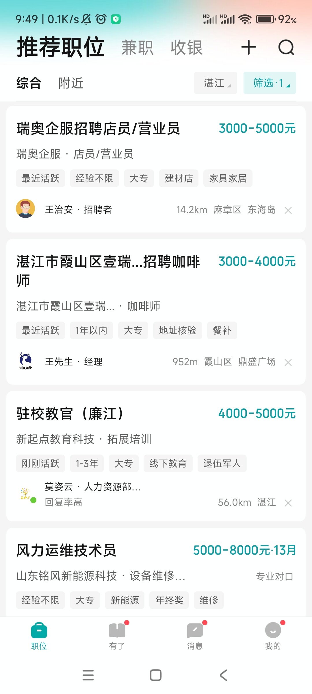 湛江比綦江垃圾,不接受反驳。只要你去那里面试,工资就是两千六百多,什么三千,四千,就两千六,全勤一百,社保?没有的,五险一金?别想了。啥都是你自费。工资还会找理由找借口扣着钱,压着几百块,说你干满多少天了,以后再一块发给你。要不然就是叫你免费试工一两天说你不合适,不用来了。