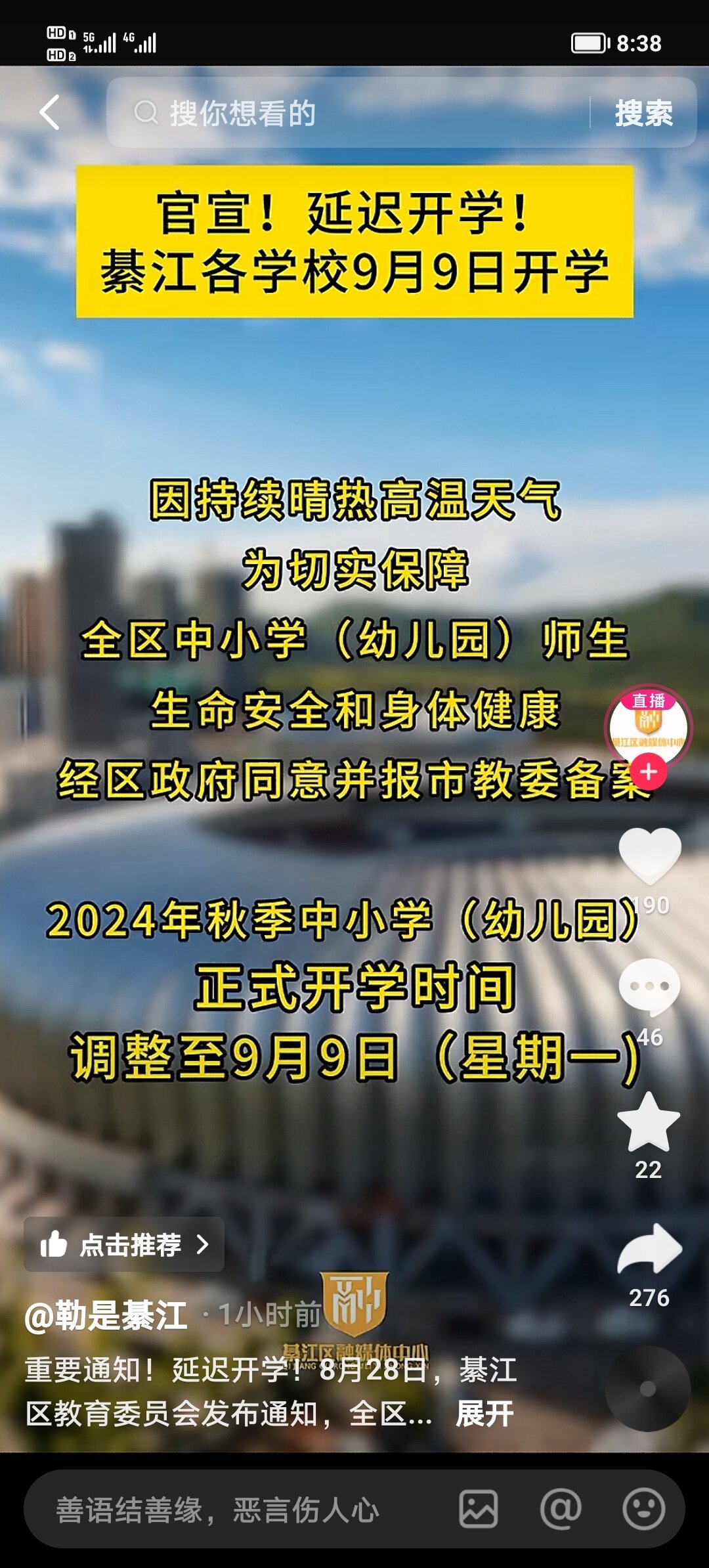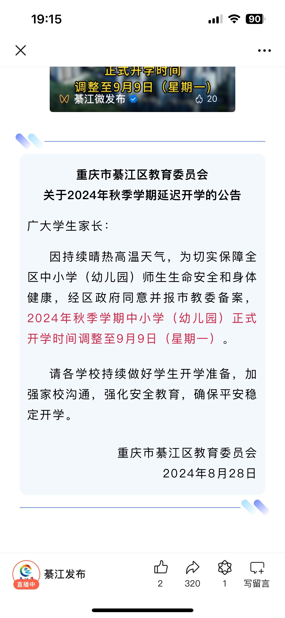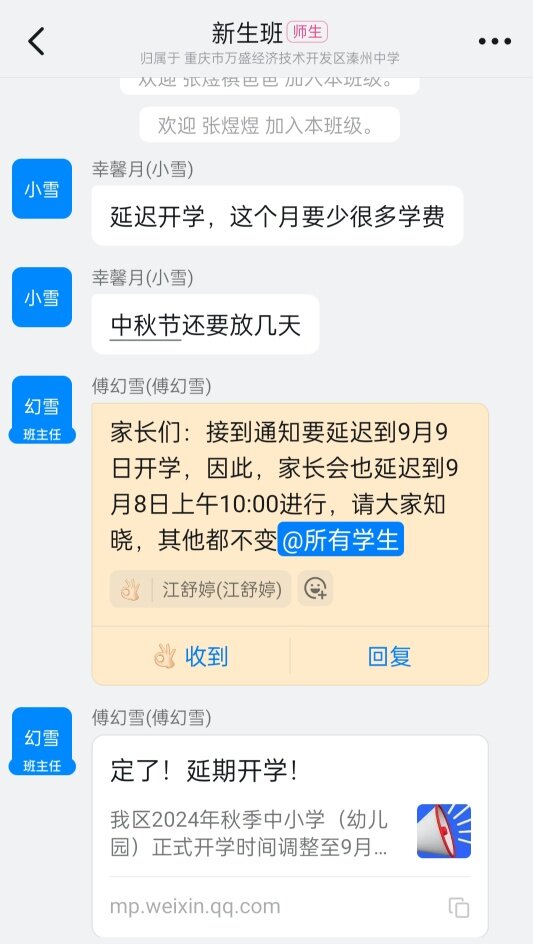 南州中学刚才已经通知9日开学了