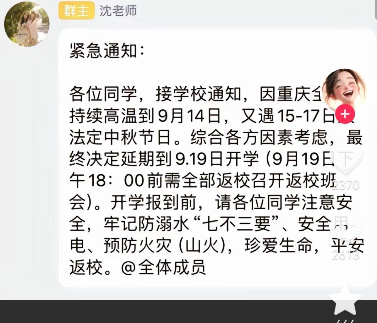 没有接到二次延期上学的通知呀,你这是綦江哪个学校哟!