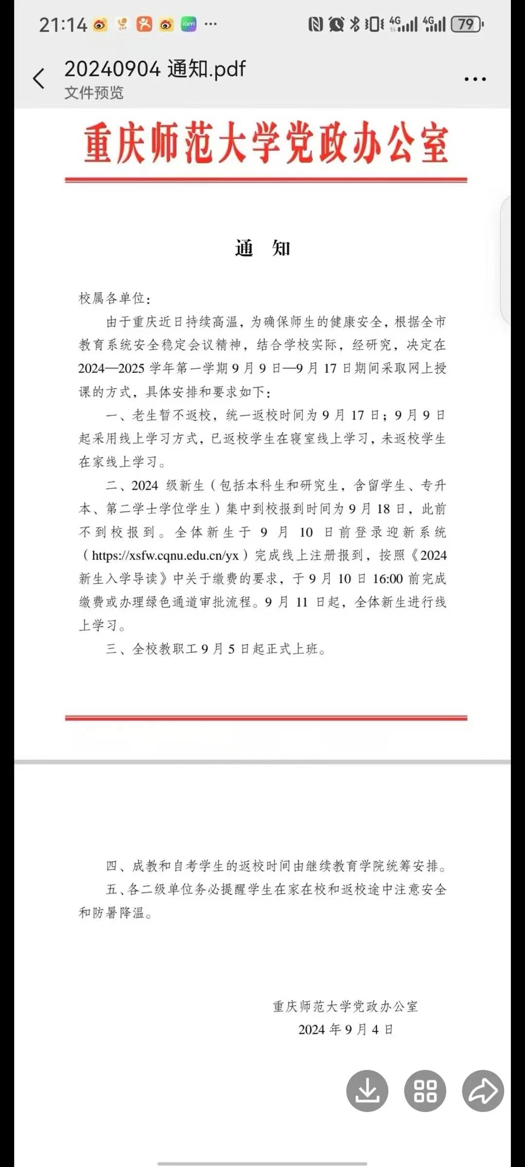 9月4日,重庆市气象台继续发布高温红色预警信号,这是自8月21日以来连续15天发布高温红色预警信号。有网友在多个社交平台发布称,重庆市将二次延迟开学,相关截图显示9月19日开学报到,9月20日上课。