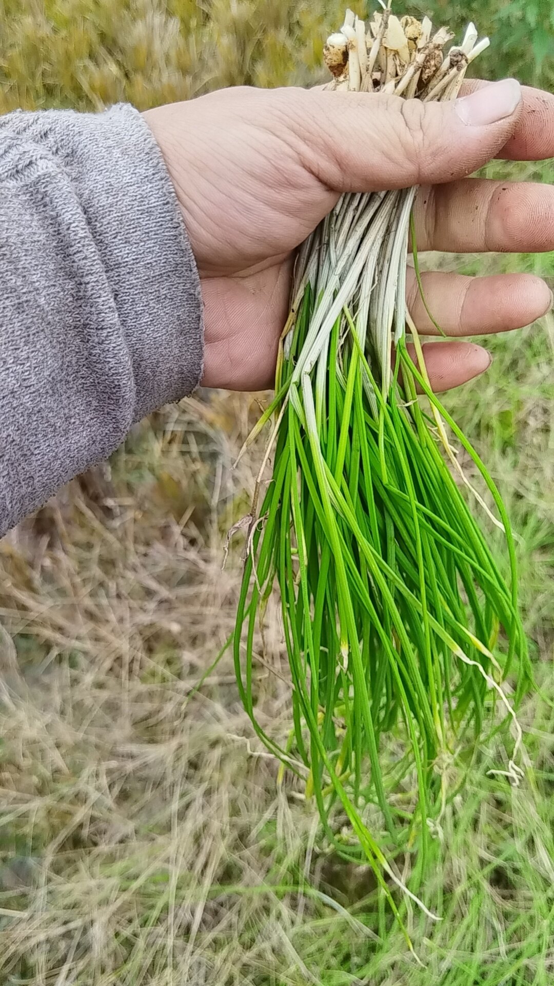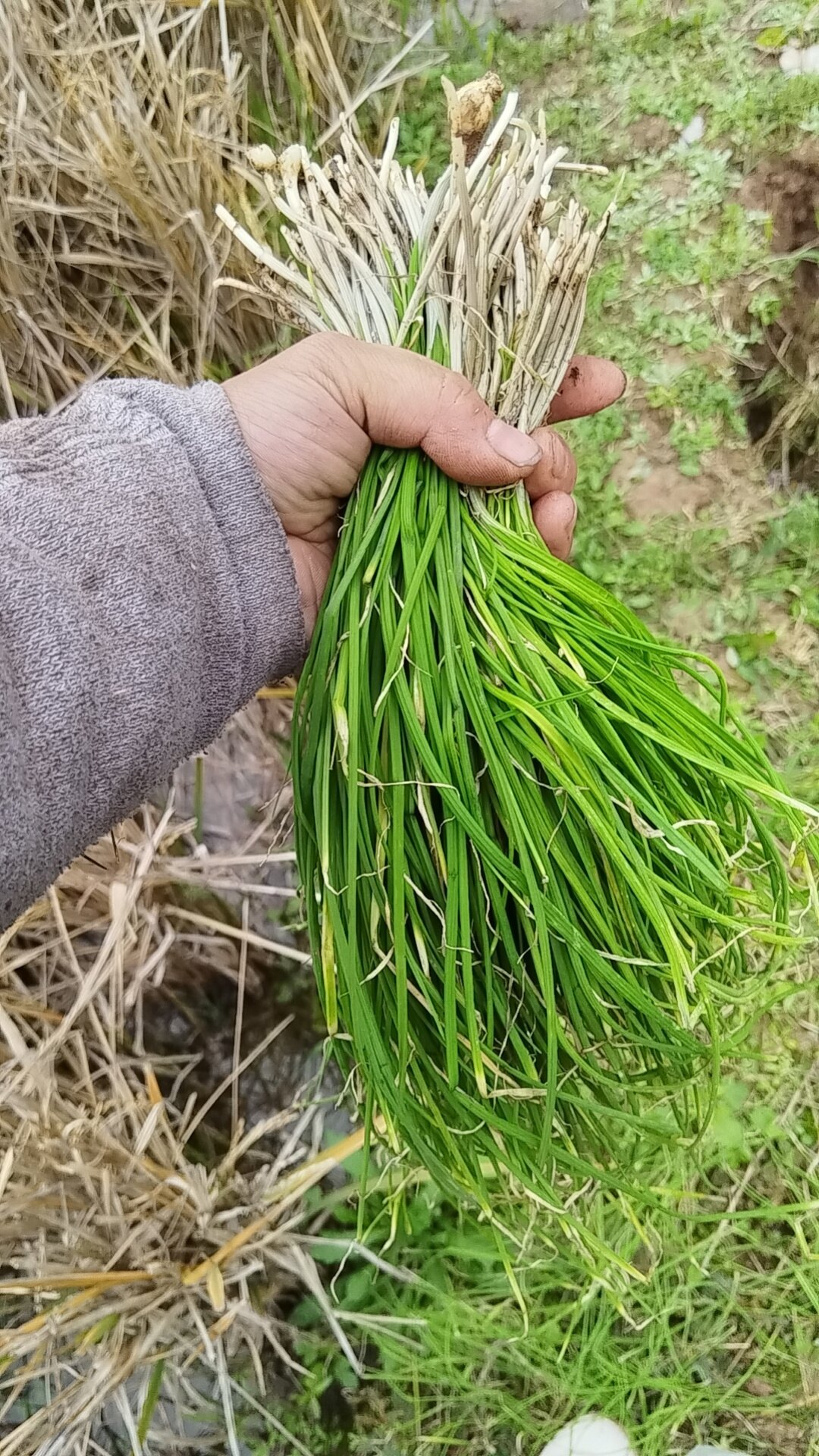 坐起理,还好。三大把野葱可能有6.7斤,小的那把理出来都有1斤多。另外两把是别人的。我撬得最多,但是我要得最少。