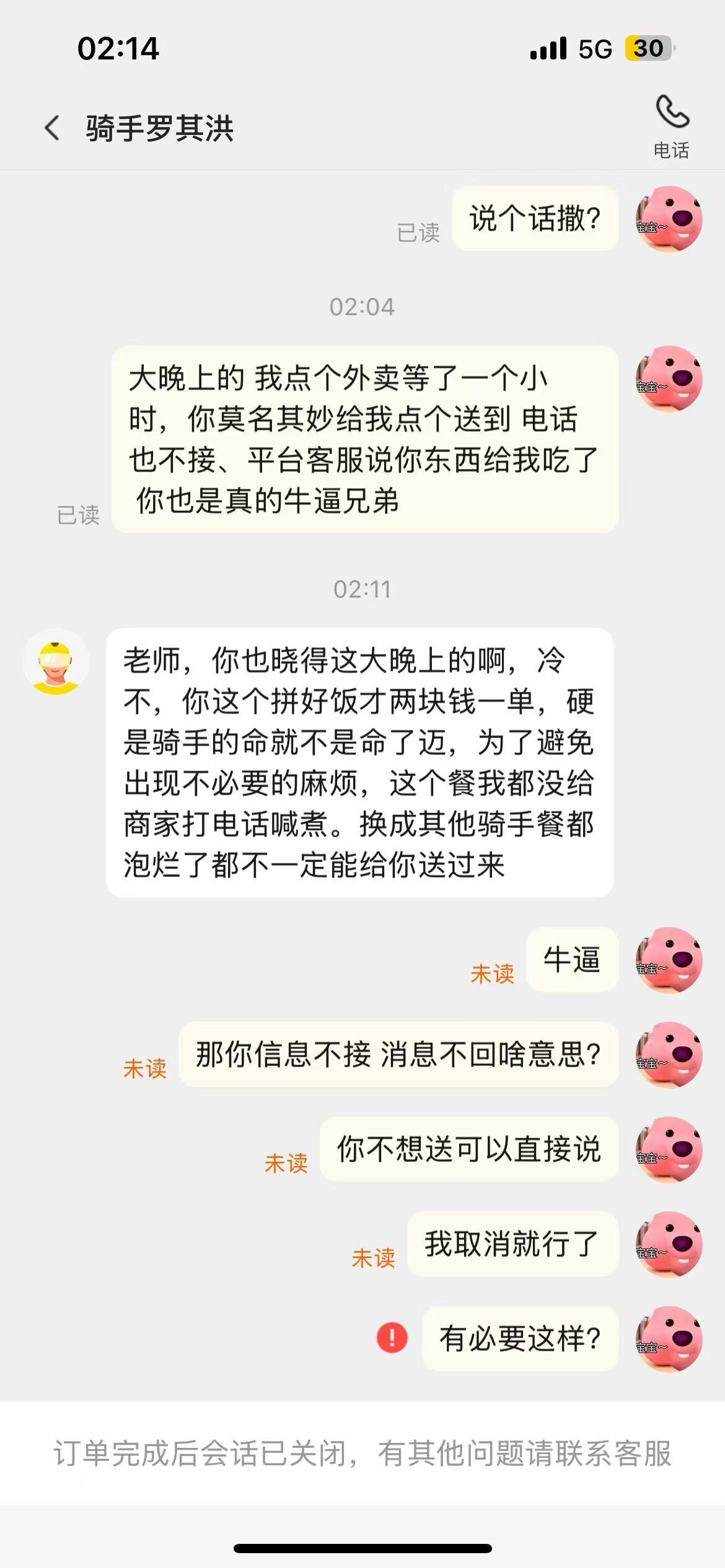 你说什么都有道理,毕竟你是站在了道德制高点的人,看不懂我说的什么。你要真想理解,都不用像骑手楞个每天送餐,你体验三天就够了。只需要三天你就晓得为啥子我不接电话不回消息了。像你这种不依不饶的人不止你一个。每个因为点拼好饭而收不到餐的人给我打电话我都去接的话,那些点主板的也不要吃了,我就每天守到顾客的电话接完再接美团的电话,然后是商家的