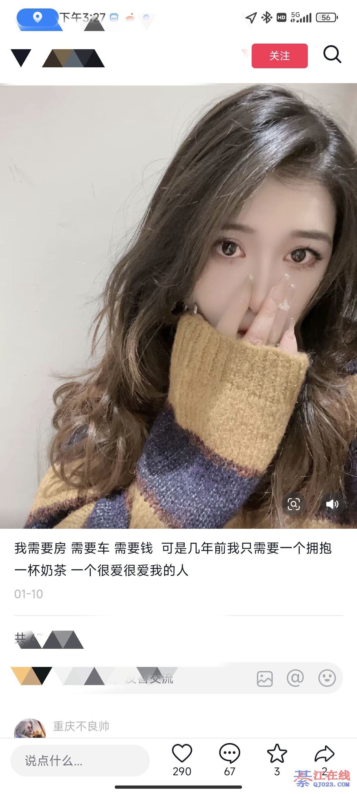 况且长得乖的 条件好的女人看不上你 所以呢 你只能在綦江在线上发泄出你的情绪抱怨 因为你满足不到女人的经济 哈哈哈哈 自卑吧?玻璃心啊 看你发的动态就晓得你是个烂1人