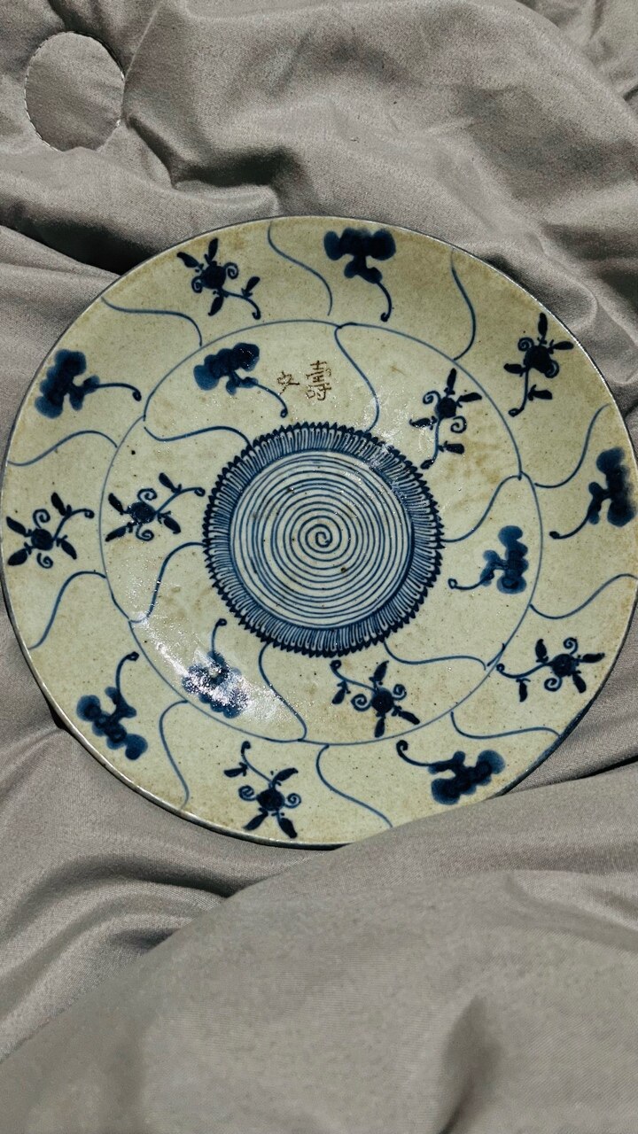 看样子像晚清同治年出产的中螺纹青花寿盘,盘面有上的“文寿”字表示一大家庭(大地主级)成套批量订购使用,盘底为窑厂标帆船“裴”字落款,整体保存比较完整未见破碎及裂痕
