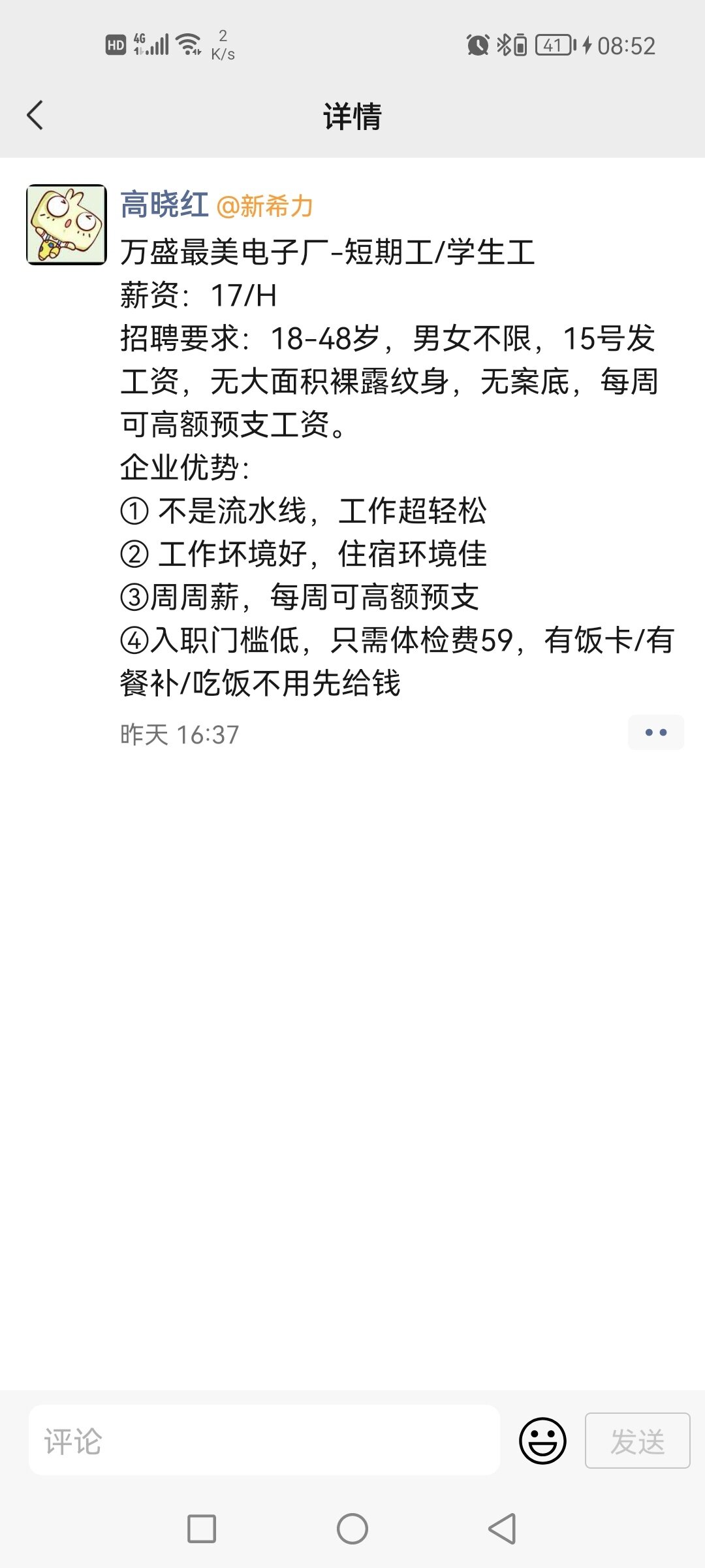 这个是黑心中介,直接去冠宇门口应聘就行了。