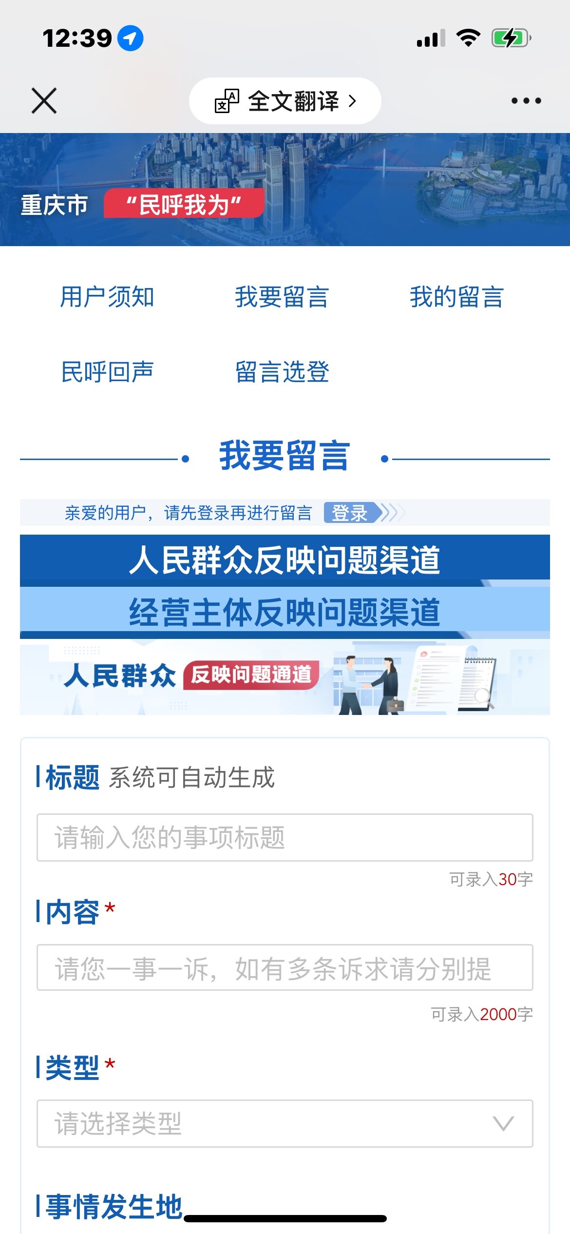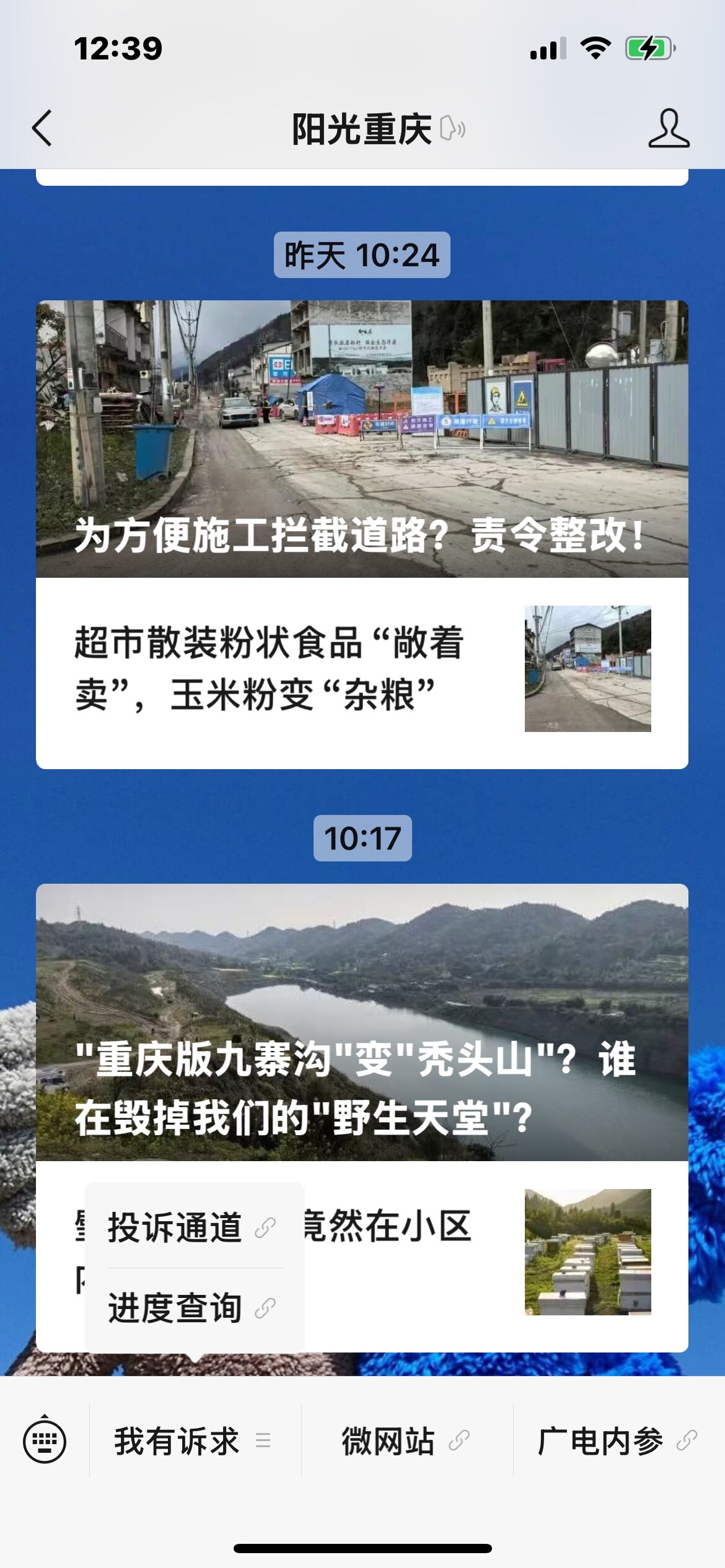 微信号搜索‘’阳光重庆‘,点击下面‘’我有诉求‘’,再点.“投诉通道‘’按提示操作输入。
