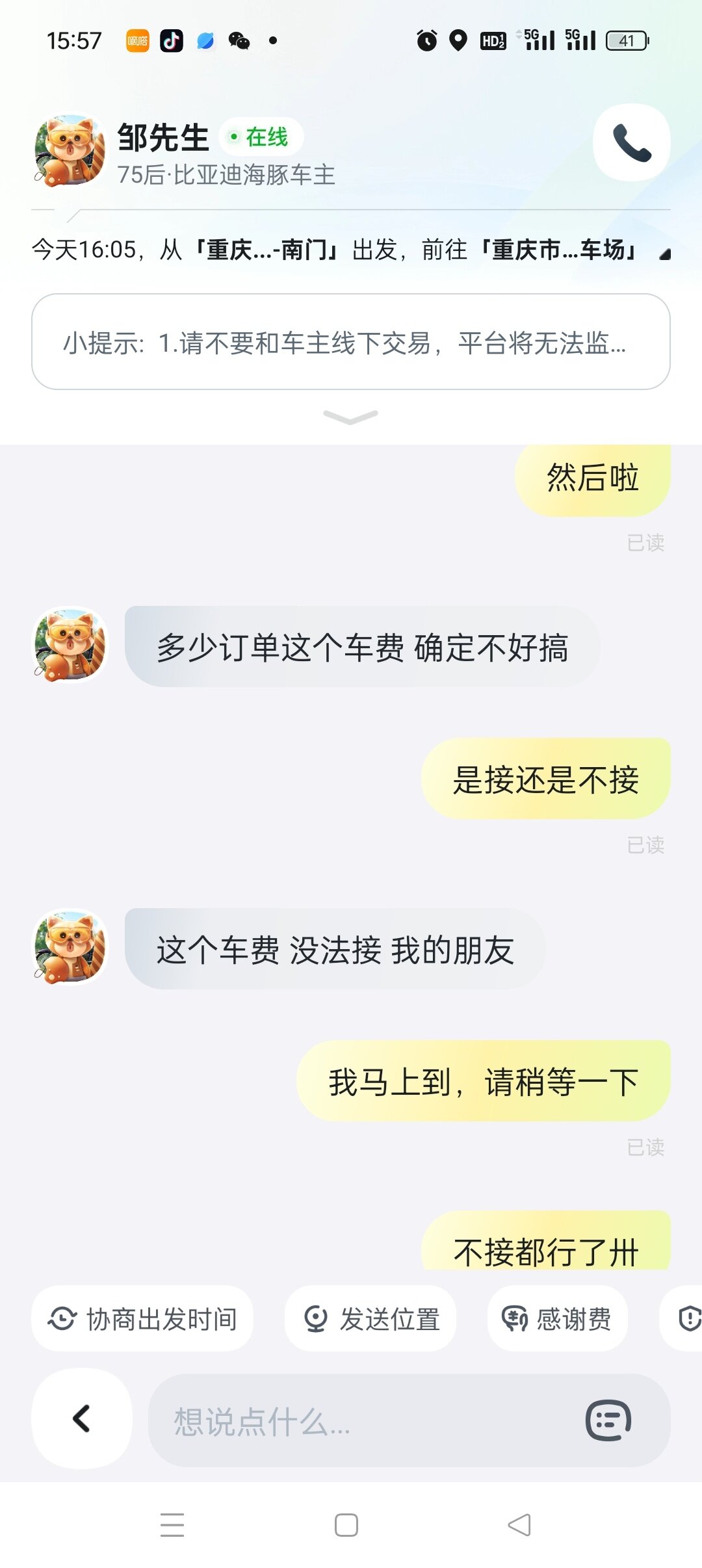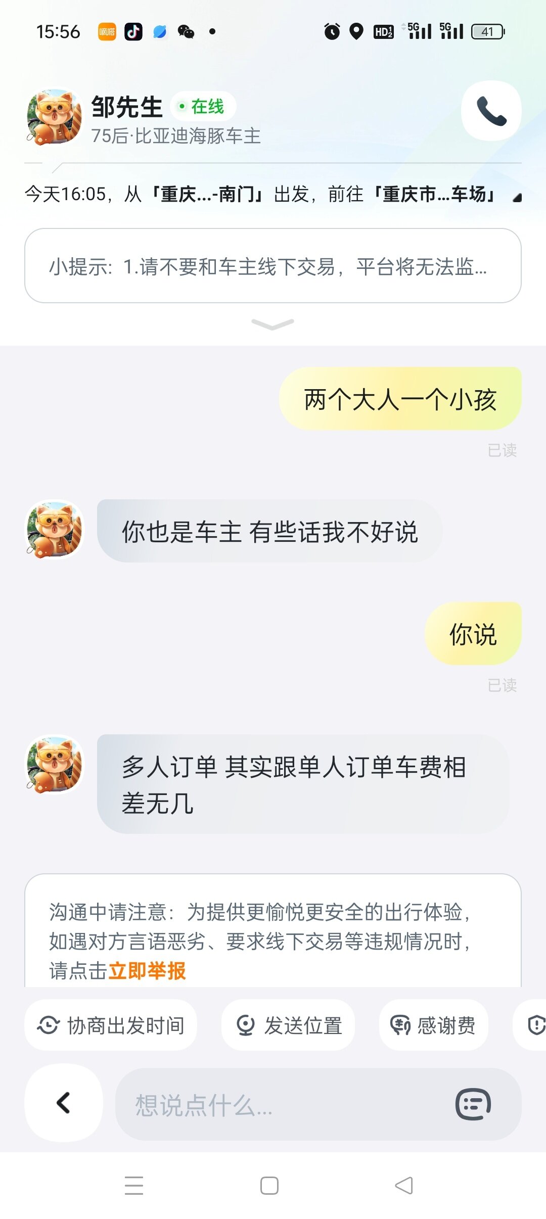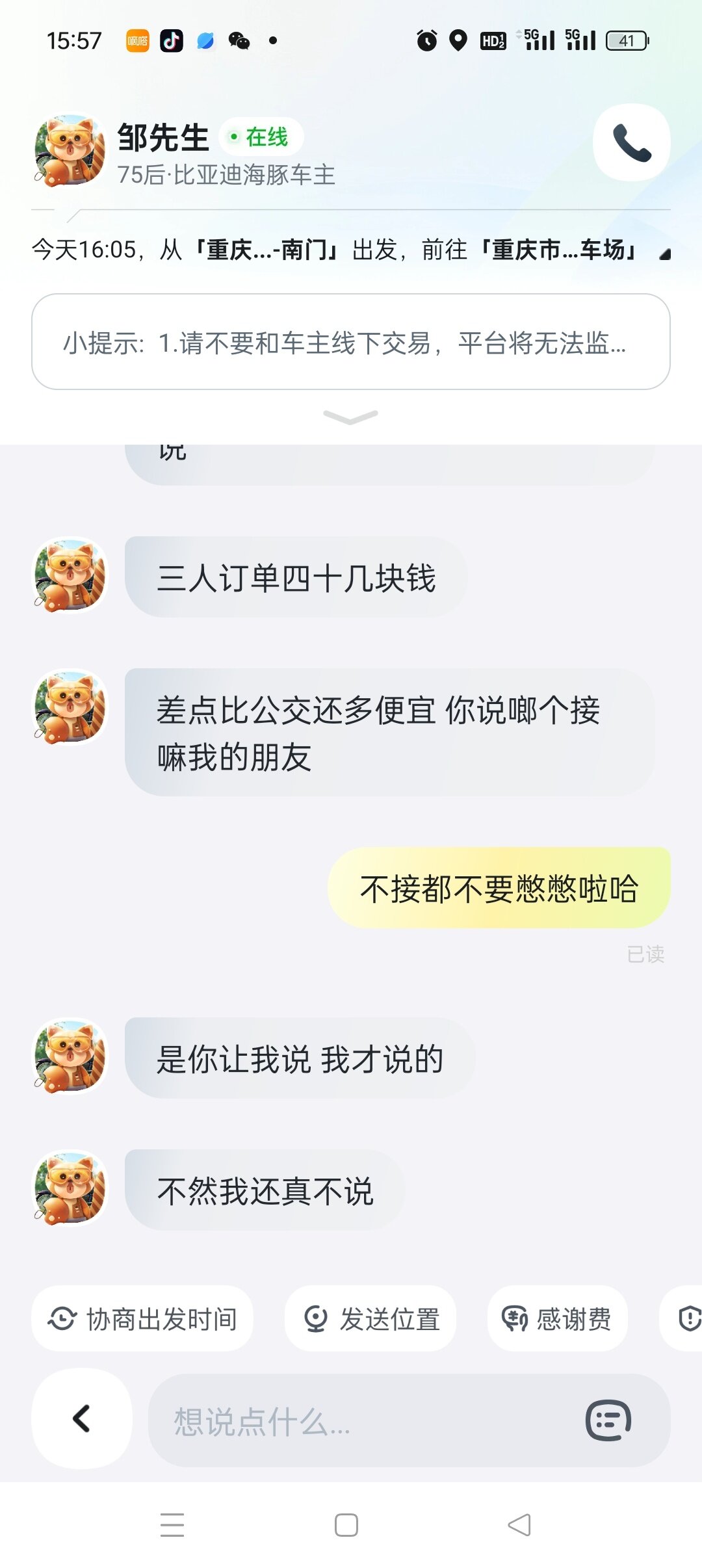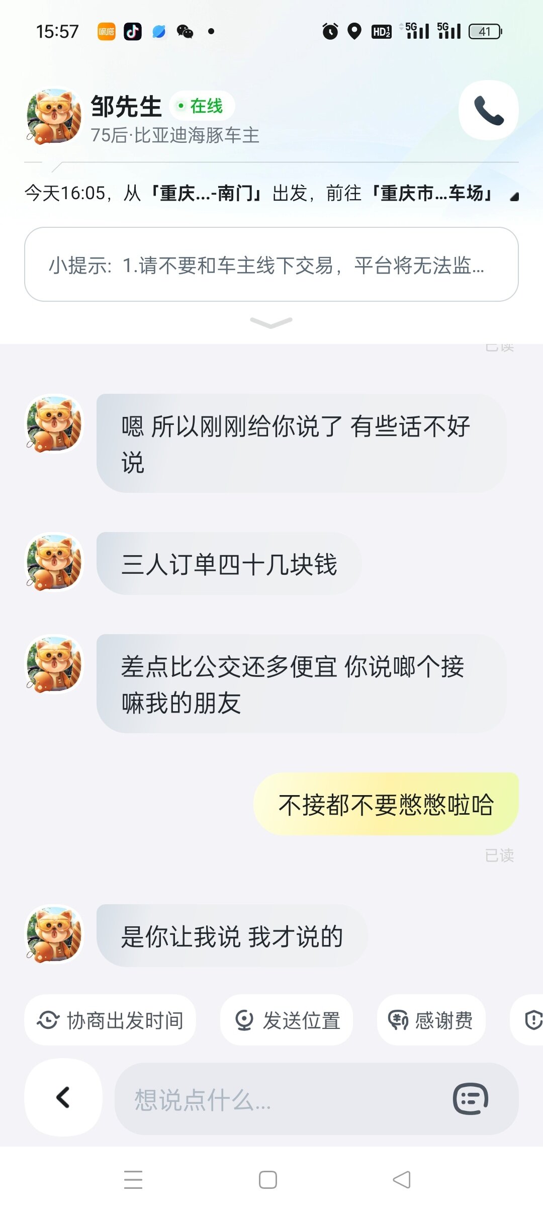车主 我也感觉你是个颠批,接了单你要加钱就直接说加多少,不加钱就取消,还有闲情雅致去谈人生理想?你一个海豚纯电,重庆回来几块钱的电费,订单有40几块钱已经超过顺风车平摊燃料费和过路费很多了,小心闪关灯哪天不高兴揪到你给你定个非法营运。私家车跑顺风风险很大的,出了事保险公司可能会已你改变车辆使用性质拒赔,你起诉,院子也有很大可能会这样认为。
