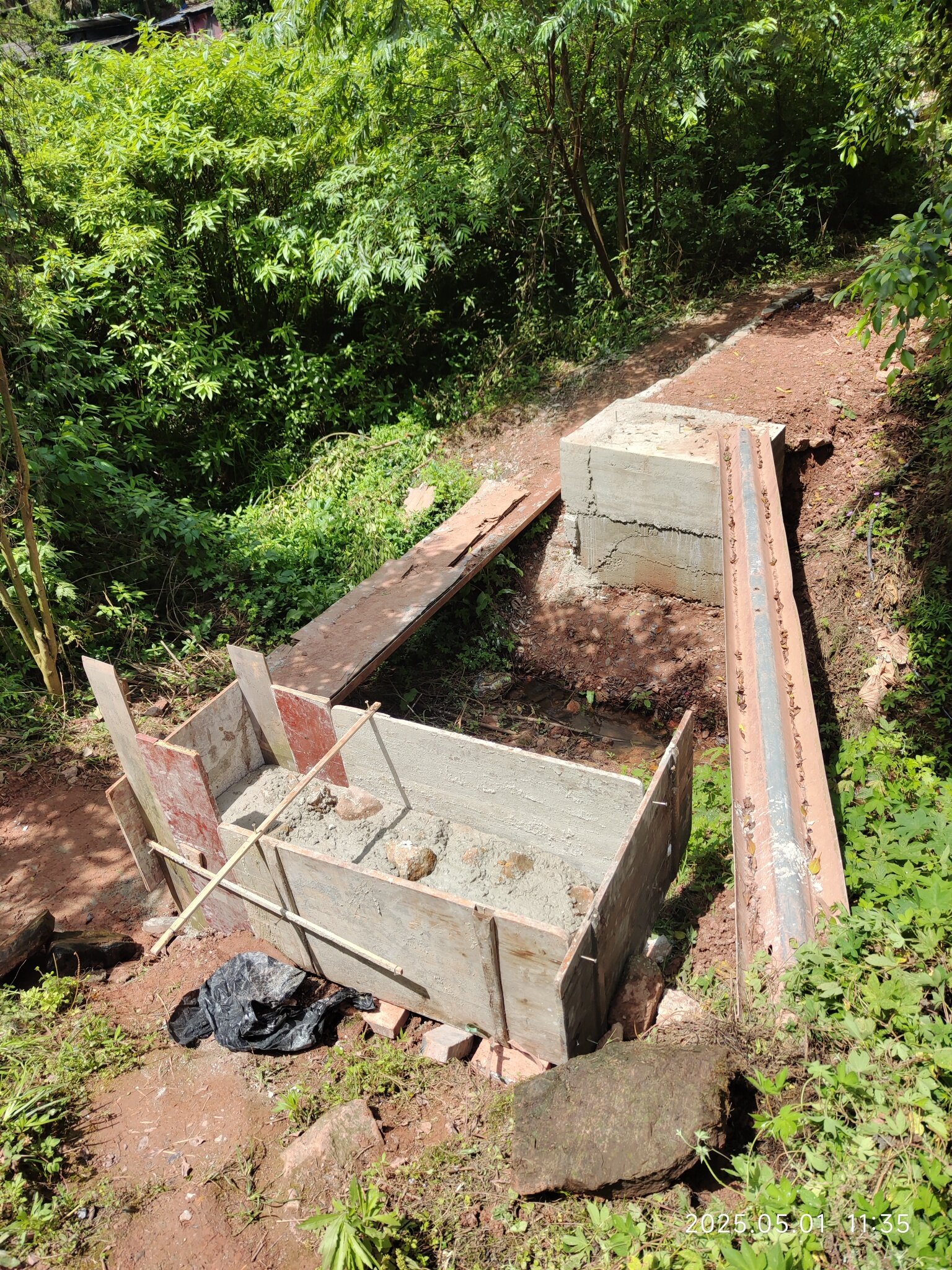 其实这个桥应用做成拱桥!先用竹片加架子搞一个圆拱形!在用红砖卡成拱桥形,在在上边做钢筋笼,加混泥土做二十厚度的拱桥!在拱桥上又多架两个支点在用板搞一个平桥面!或两边做砖填土在纲筋加混凝土浇筑桥面!这个受力才好