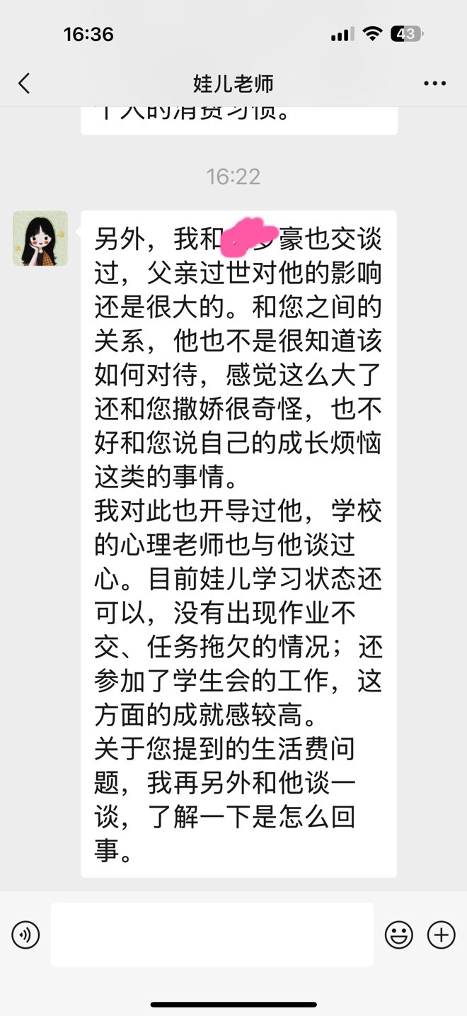 你也不容易,娃儿长大了要学会感恩,老师要和他沟通
