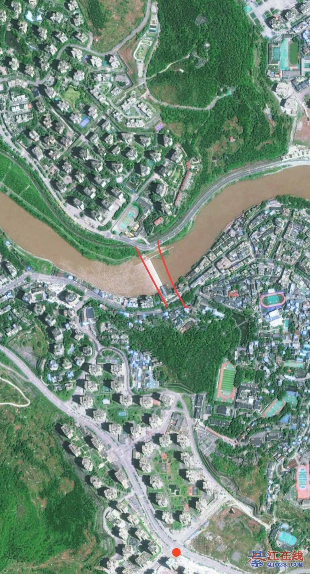 应该在闸坝位置,陵园路口接到沙溪铁路立交,桥头通过闸道连接各条支路。