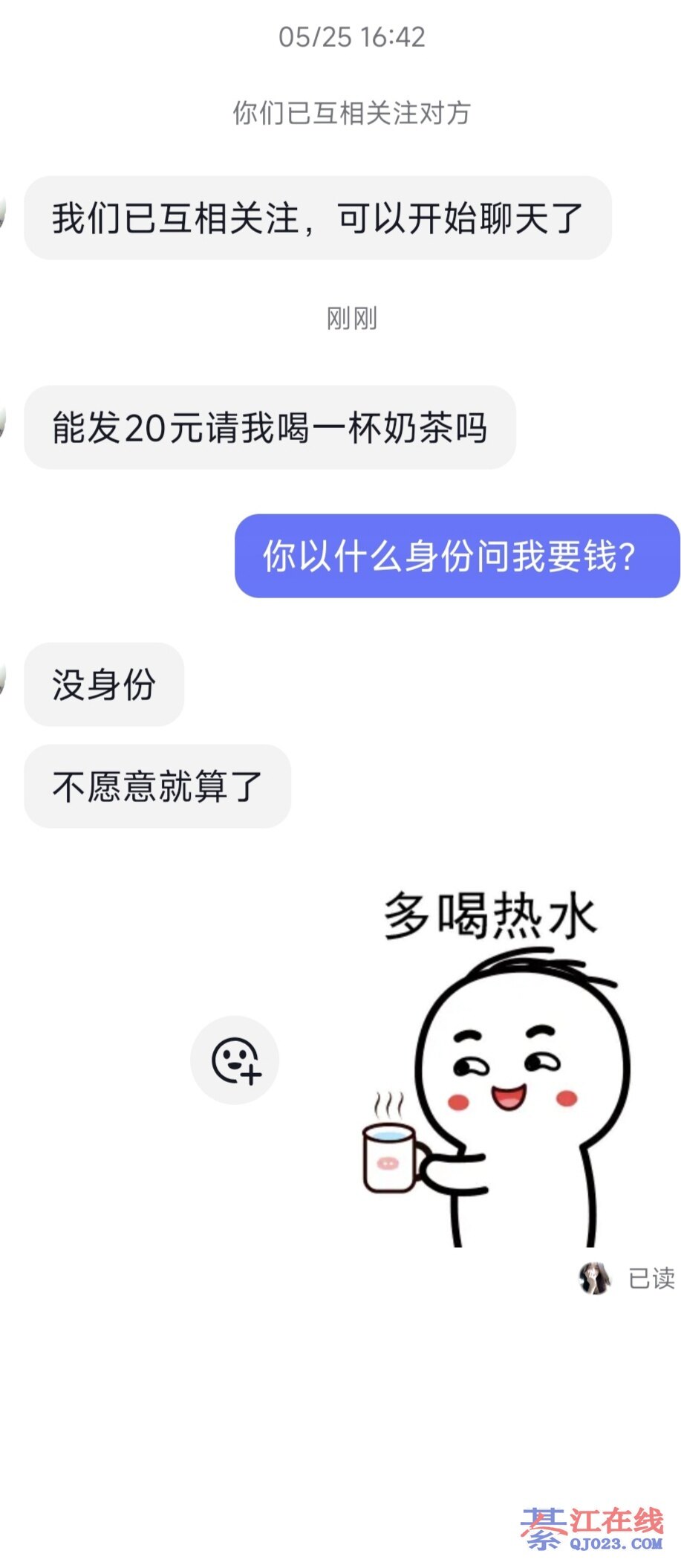 别个看你的在线名称就知道你打的什么主意,所以先喊你给钱买杯奶茶再考虑其它。结果你是舍不得孩子套不着狼