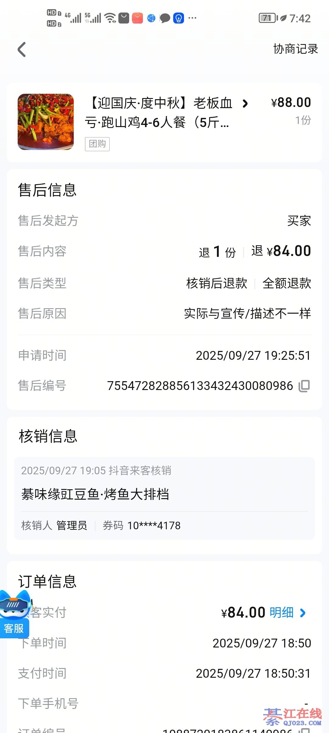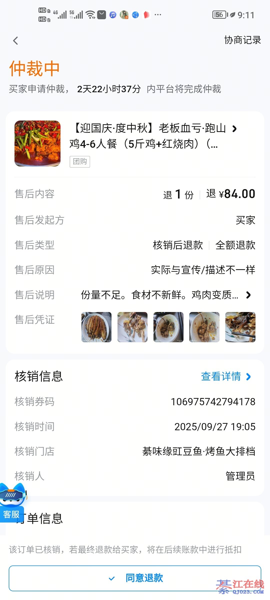 抖音团购的,吃了走后才在平台申请全额退款,平台也仲裁无需退款并关闭申请,如果是在店里当面说出问题如果是事实我恳定解决,全额退款也无所谓,而且另外吃的人客人也都说还可以。比如昨天客人说的吃烧鸡公,厨师做成梁山鸡了,客人吃了给我说还是做成梁山鸡了,她吃不惯梁山鸡的药味道,我立马就让厨师重新做一锅烧鸡公换上,因为是我们自己的失误。我并不是在乎那几十块钱,而是关乎名声,如果是有人故意利用网络摸黑,如果退了,那不是就正好成为别人宣染的证据吗?