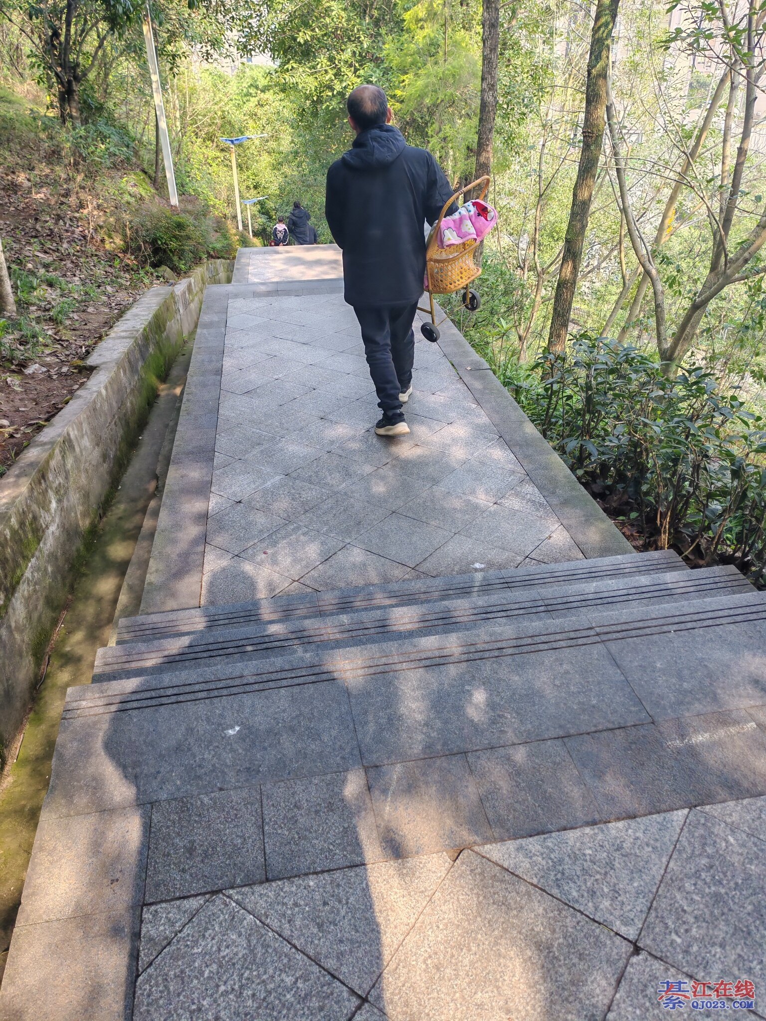 你别说,我上个月也是这样端着推车上去的,把我累的够呛,当时心里面想的也是怎么不修一条可以推车的小路