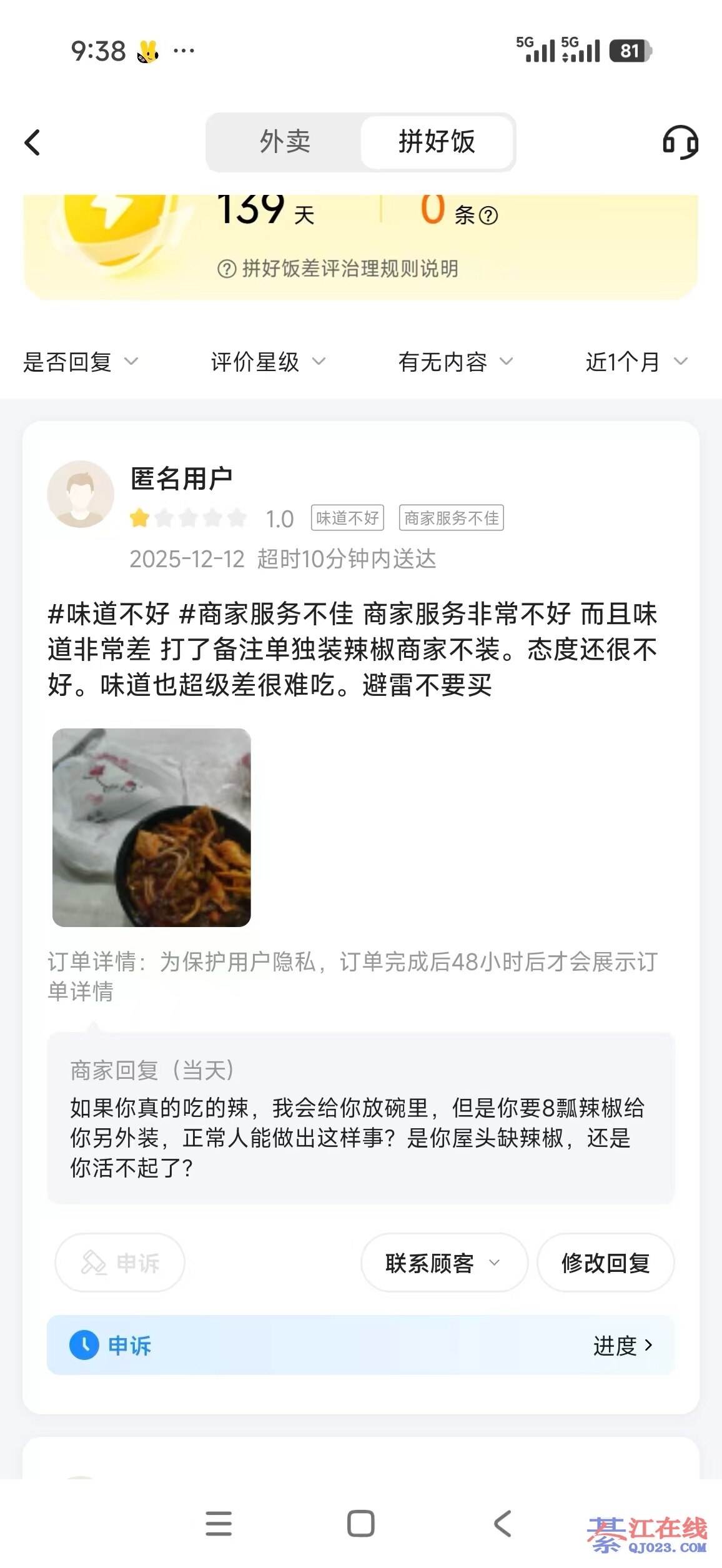 是这样的,我之前点外卖说要多辣,商家一般在上面会给我加很多很多辣椒,他这种纯粹就是无理。