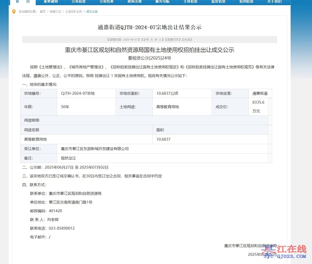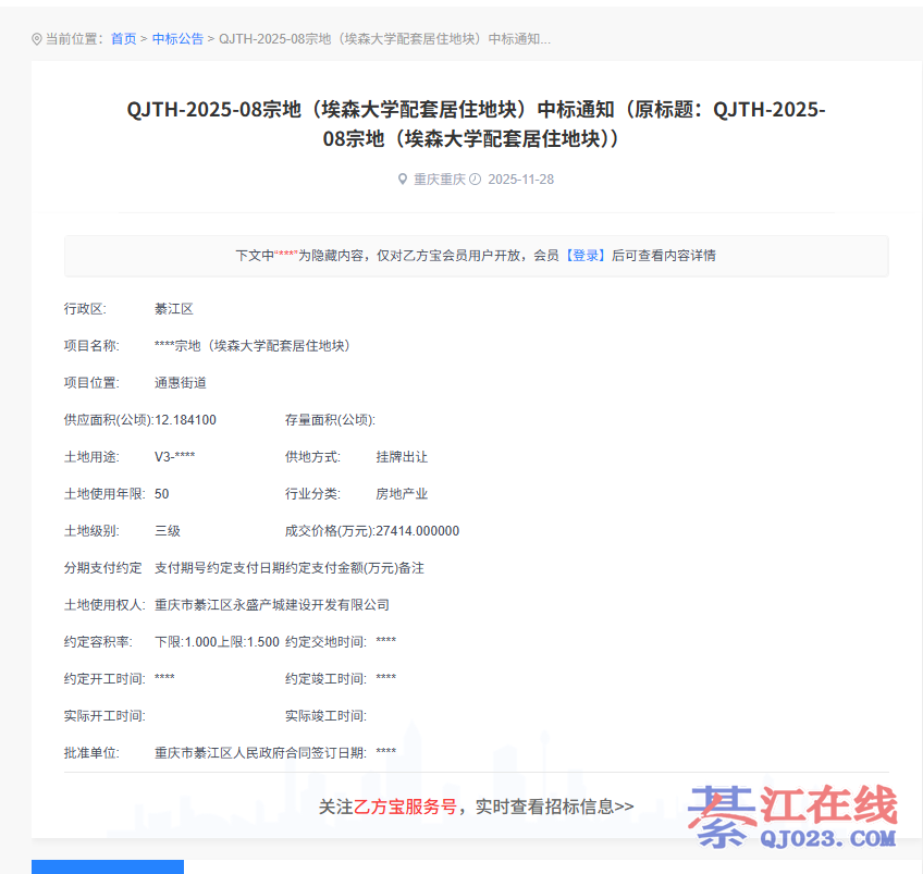 没有搞懂,是2021年綦江区引进的高校,重庆德国埃森大学地块已经出让?还是“2021綦江区引进重庆德国埃森大学建设用地,綦江区于2025年6月27日正式确认出让。”初看还以为埃森大学所需地块不要了,出让返还给綦江区。
