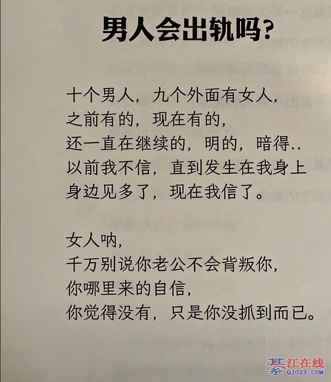 男人出轨还不是女人造成的,女人不给机会,男人想出也出不了