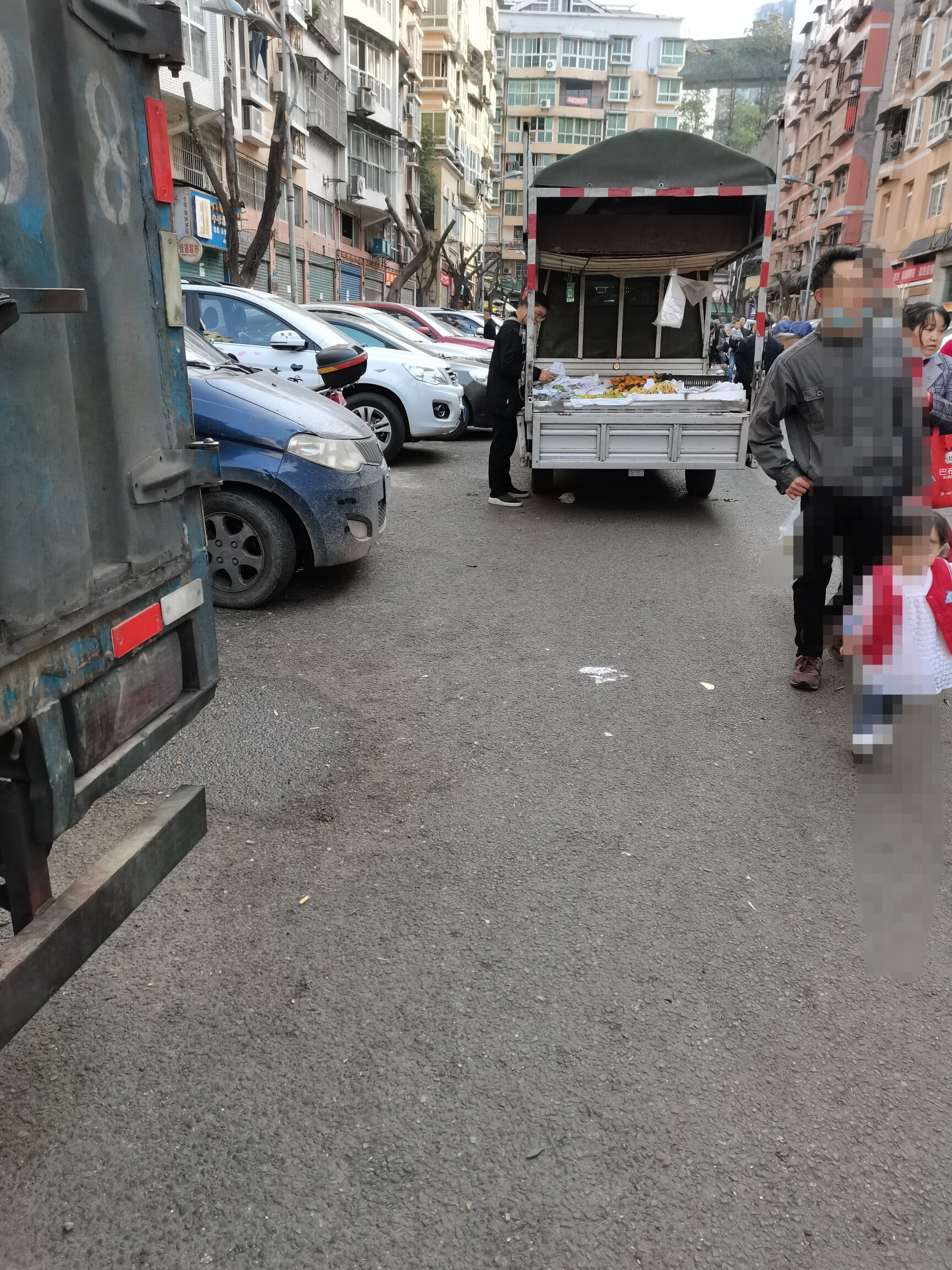 老水果市场一条街道停车与卖东西的堵得死死的