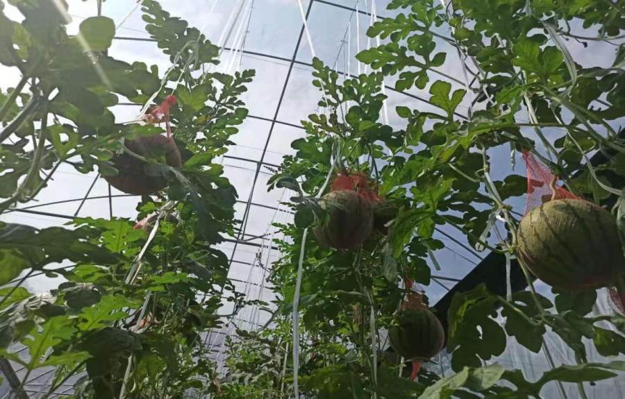 看着这一个个吊起来的西瓜,我好奇的问了问旁边的其他工作人员,听了他们耐心的讲解。我才明白,原来,西瓜吊起来长是这里西瓜种植的一个特点。这种种植方式不仅利于节省种植空间,而且还能提高西瓜的品质和产量。不得不佩服劳动人民的智慧啊!我和女儿耐心的听着,可长了不少见识哦。