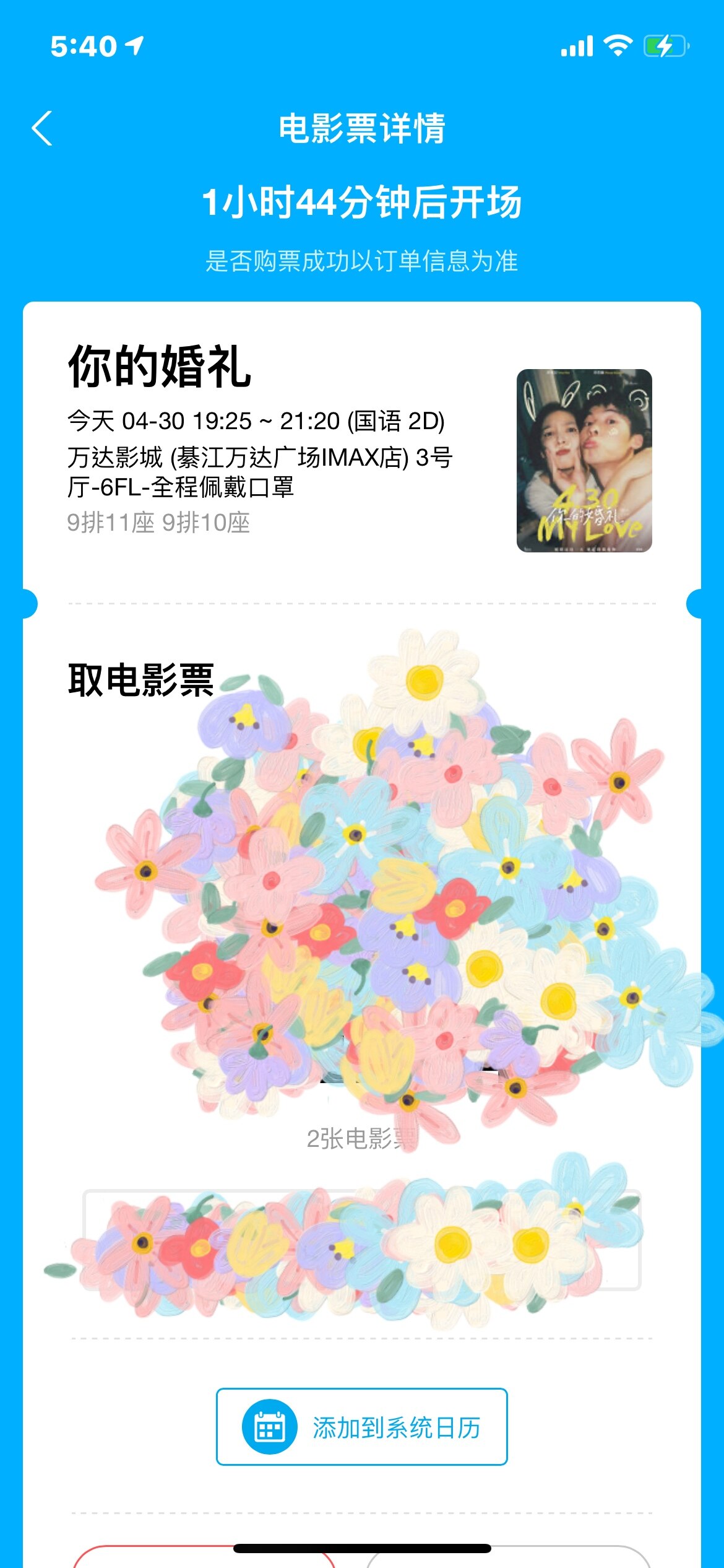 出两张今天的电影票,你的婚礼,位置好