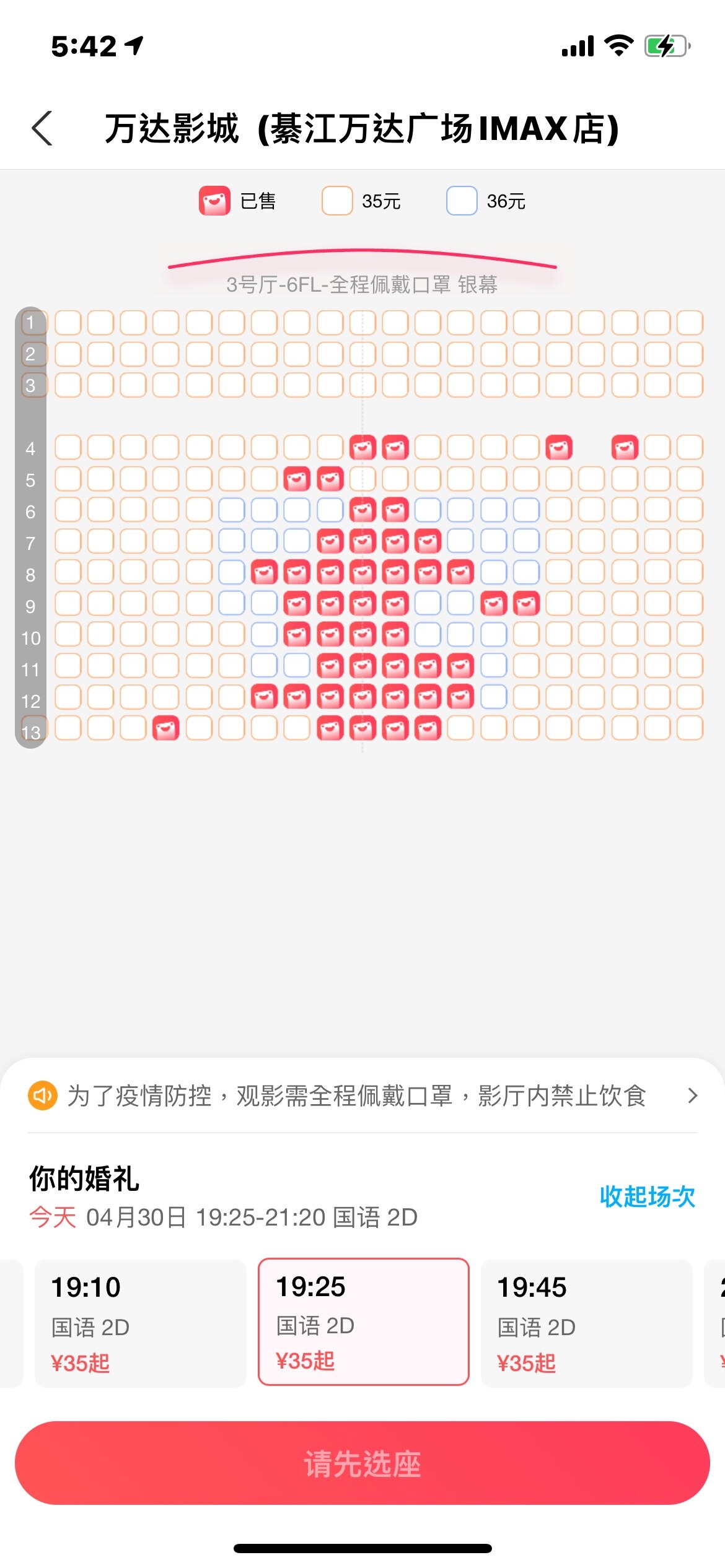 出两张今天的电影票,你的婚礼,位置好,七点二十五的,看图